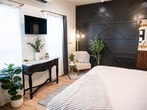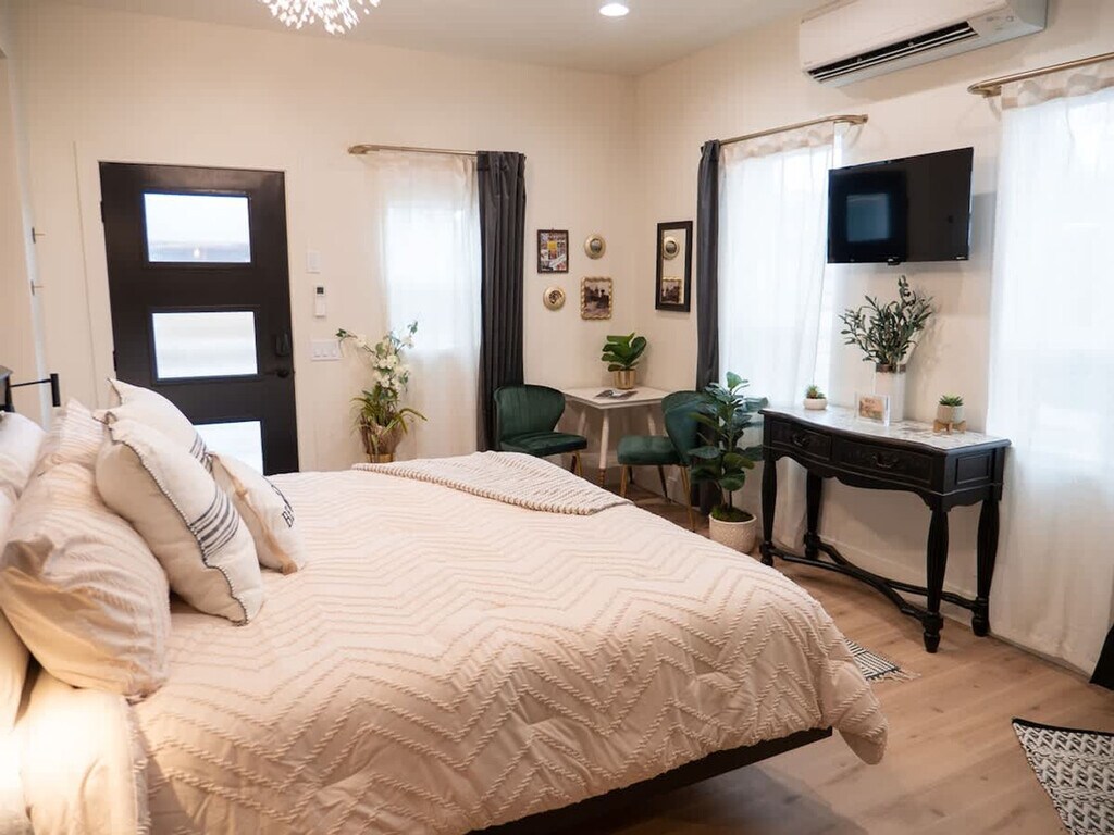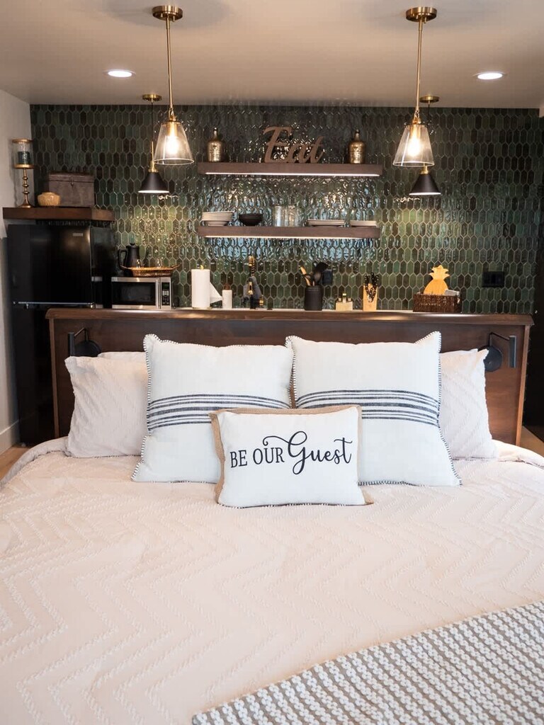 Plan your trip to Boise now in our "Little Sunset" secluded getaway! Feel at home in this private suite tucked away from the road, exuding a James Bond sexy vibe. Custom features in this studio provide a luxurious and comfortable stay after a day full of adventure. The kitchen is adorned with stunning emerald green tiles and includes a sleek dishwasher, a compact hot plate, a sophisticated wine bar, a modern refrigerator, and a full-sized washer and dryer discreetly tucked away inside a closet. The centerpiece of the guest house is the floating king-size bed, an exquisite piece of craftsmanship featuring hand-carved wooden details. The bathroom is a masterpiece of design, featuring a large white tile shower with expansive glass doors, rain shower heads and pristine craftsmanship. Well-behaved pets are allowed with prior approval and a per pet fee of $50 per stay. The home is located in the historic Sunset Avenue neighborhood between 28th and 36th St. in downtown Boise. The guest house is surrounded by lush greenery and a high, elegant fence, offering a secluded sanctuary. Step outside onto the cozy patio, where you can relax under the soft glow of café lights strung beneath a charming canopy. The entire area is privately fenced, ensuring complete seclusion. Parties, events, and unauthorized gatherings are strictly prohibited and violation may result in immediate termination of the reservation without a refund and an additional cleaning or disturbance fee. Smoking (including vaping and cannabis) inside the home will result in a $250 cleaning fee. Only guests included in the reservation are permitted on the property unless approved in advance and additional unregistered guests may incur a $100 per person per night fee. Quiet hours are from 10:00 PM to 8:00 AM and tampering with security devices is strictly prohibited and will result in cancellation without refund. Late check-outs beyond 30 minutes without prior approval will incur a $300 fee. [SI]