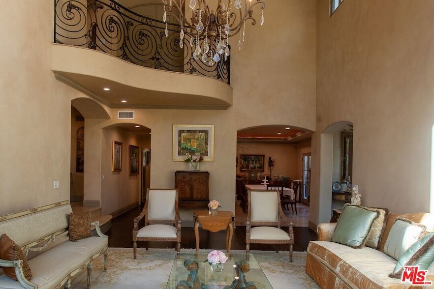 Perched high above the street in the coveted Royal Hills of Encino, this magnificent modern Mediterranean villa offers unrivaled privacy, natural light, and dramatic curb appeal. Completely rebuilt in 2007, this architectural gem blends old-world craftsmanship with luxurious contemporary living, featuring bespoke finishes, intricately carved wood doors, coved ceilings, and gleaming wood and travertine floors throughout.Enter through a grand two-story foyer into an expansive living room flooded with natural light. The formal dining room with its own balcony sets the stage for elegant gatherings, while a second family room offers warmth and intimacy. The heart of the home is a stunning chef's kitchen with an oversized island, double ovens, double sinks, a large pantry, wine fridge, and abundant storageideal for entertaining or everyday luxury. The adjacent breakfast area opens to a lush backyard through double French doors, revealing a sparkling pool with fountain features, a cozy gazebo for shady respite, and a grassy play area, all perfect for al fresco dining and relaxation. Upstairs, a private staircase leads to a gracious landing and a sprawling primary suite retreat, complete with fireplace, dual walk-in closets, and a spa-inspired bath with a jetted tub, double shower, and dual vanities. Two additional upstairs bedrooms each enjoy en-suite baths, while the main level offers two more bedrooms, ideal for guests or home office use. A three-car garage and a private elevator provide direct, convenient access to the main living level, completing this exquisite and thoughtfully designed estate. The prestigious Royal Hills neighborhood is well located to many commuter roads to the Westside and to the Valley, as well as private schools and the coveted Lanai school district.