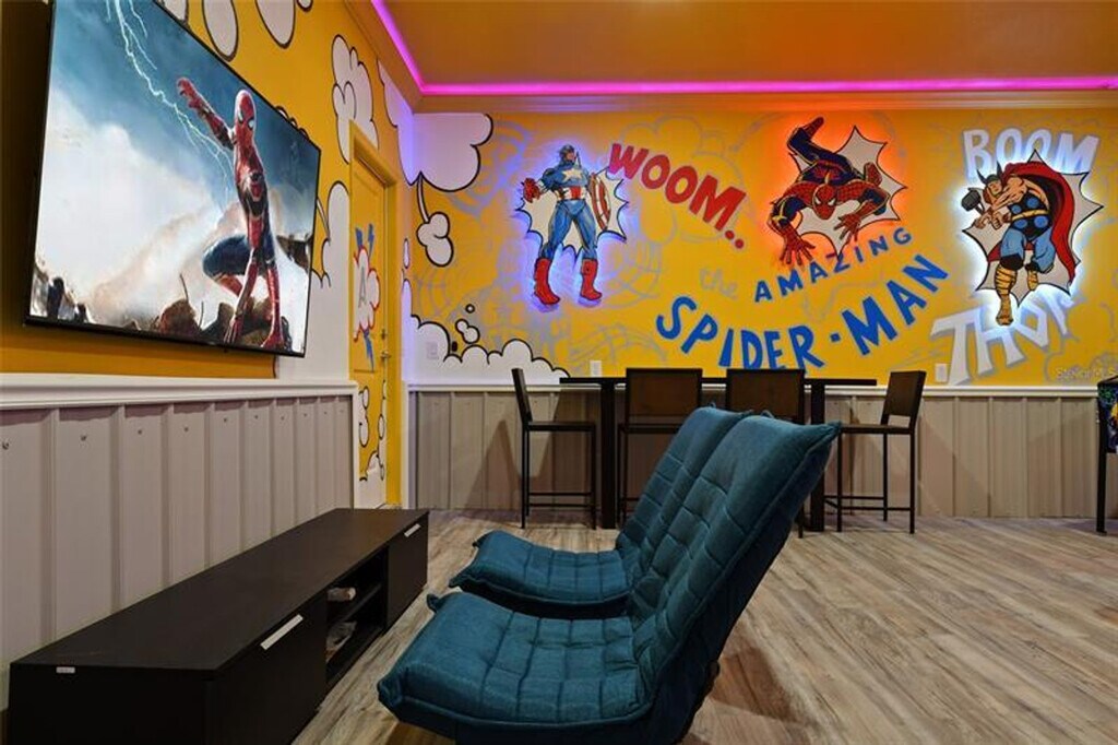 Savor the grand paradise of this spacious 9-bedroom villa in Davenport, Florida, designed to accommodate over 16 guests with absolute comfort and luxury. Located just minutes away from Disney's famed theme parks, this villa is an ideal haven for big groups and family vacations, offering a holiday of a lifetime with cherished memories and magical Florida moments. Welcome to this lavish villa, where unparalleled comfort meets ornate elegance, creating an extravagant retreat for unforgettable moments. The two-story property boasts nine bedrooms and eight baths, comfortably accommodating over 16 guests. The charming living room invites you to sink into plush furnishings while enjoying spectacular poolside views through expansive glass doors. Recreation echoes throughout the home, with a flat-screen TV for casual entertainment and a dedicated theater room for immersive family movie nights. Each of the nine bedrooms offers distinct aesthetics, equipped with plush king-size beds and fine linens to guarantee restful slumbers. The fully functional kitchen is a gastronomic dream, outfitted with modern appliances to create gourmet delights. An adjoining dining area caters for ten, while the outdoor space makes room for an additional eight, ensuring every meal is a banquet. The exterior features a vivacious pool, a soothing spa, and a fully prepared outdoor kitchen ready for unforgettable BBQ nights. Additional charges may apply for extra services like BBQ usage and pool and spa heating. This property encourages long-term stays, ensuring guests thoroughly enjoy the imminent season, upcoming holidays, and proximity to famous attractions. This vacation rental community offers a plethora of resort amenities, building upon the features found in its sister communities, Windsor Hills Resort and Windsor Palms Resort. The highlight is a remarkable 5,000 sq.ft. clubhouse, complete with a massive resort-style pool featuring cabanas, a water slide, and a lazy river, perfect for endless family fun. The clubhouse also boasts a tiki bar serving your favorite beverages and a delectable menu for poolside dining. For fitness enthusiasts, there's a well-equipped gym with the latest cardio and strength training equipment. You can engage in friendly competition on the sand volleyball courts and multi-purpose sports courts. Additionally, there's a sundry shop within the clubhouse, along with a video arcade. Windsor at Westside is a gated community with on-site security to ensure the safety of all guests. Imagine savoring your Thanksgiving dinner within the elegance of the capacious dining area, or dipping into the heated pool on a brisk fall evening while the world beyond celebrates Halloween. Even better, imagine welcoming Christmas or the New Year ensconced in the endless comforts this property offers. Picture the enchantment of a Disney journey, with Magic Kingdom, Hollywood Studios, and Epcot just a stone's throw away. Then, wind down your adventurous day with meals at some of the area’s best restaurants, adding a local flavor to your culinary quests. Experience the magic of Disney, the charm of Davenport, and the luxury of this villa for a vacation like no other. [SI]