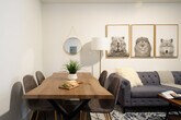 Welcome to this brand new 3-bedroom apartment, newly renovated and located in the prime Hudson Yards area. The first bedroom features a queen-size bed with windows that allow natural light to illuminate the space. The apartment is adorned with neutral décor and modern furnishings throughout. The second bedroom also includes a queen-size bed, complemented by neutral décor against blue velvet curtains and a full-length mirror covering the closet. The third bedroom offers a full-size bed, and the spacious living room includes a queen-size sofa, a large dining table, and a desk that serves as a home office. This apartment is perfect for unwinding after a long day in NYC, featuring a dining table, smart TV, and state-of-the-art kitchen appliances. With plenty of desk space and Wi-Fi, you can easily get work done and stay connected. The apartment includes ample desk space and Wi-Fi, making it ideal for remote work and staying in touch.
