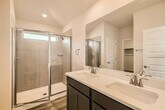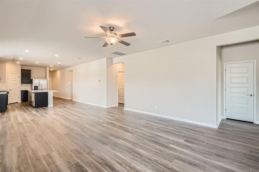 This recently constructed single-story home at 360 El Capitan Loop features 4 bedrooms and 3 baths on a corner lot in the Big Sky Ranch community. The open floor plan places the primary bedroom separated from the secondary bedrooms. The kitchen includes a center island with quartz countertops, stainless steel appliances, a walk-in pantry, and custom built-in cabinet shelving. The primary suite offers bay windows overlooking the backyard, a double vanity, walk-in linen closet, and an oversized walk-in closet with custom shelving. Throughout the home you'll find luxury vinyl tile in main living areas and carpet in bedrooms. Additional features include a whole-home water softener system, security system, covered back patio, and a laundry room with Whirlpool washer and dryer included plus extra storage space. Custom closet shelving is installed throughout. Residents enjoy Big Sky Ranch pool and playground access, with the home located minutes from HEB and offering quick access to Highway 290.