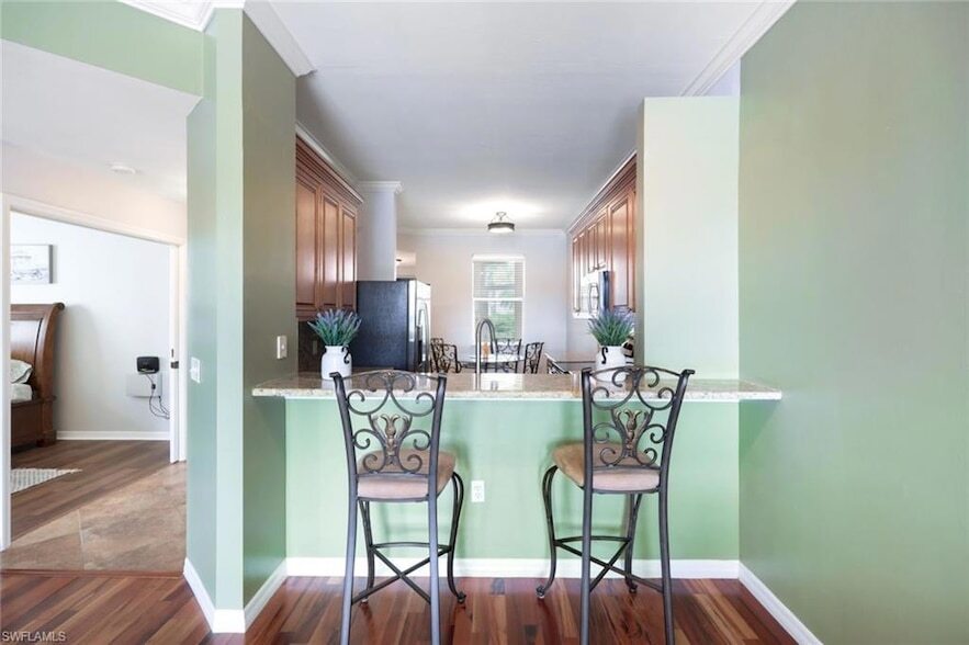 Immaculate 1st Floor Coach Home with Lake View in Sherwood! This beautifully furnished 2+Den, 2-Bath coach home offers a tranquil lake view and a spacious open floor plan with crown molding, attached garage, and a private screened lanai. The kitchen includes stainless appliances, pantry storage, and breakfast bar seating. Primary suite features dual closets and an ensuite bath with separate tub and shower. Located in the desirable Sherwood community, enjoy resort-style amenities including 2 heated pools, fitness room, clubhouse, tennis courts, and walking paths. Just minutes to shopping, dining, downtown Naples, and white sandy beaches.