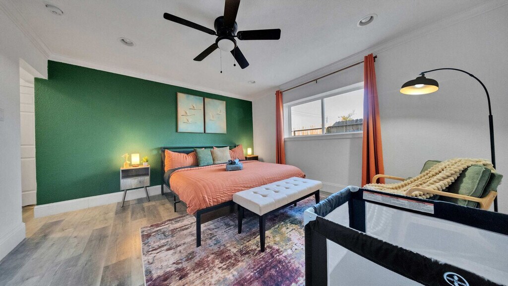 Feel at home in this spacious 6-bedroom home, perfect for families, groups, or corporate teams. This open-concept home blends comfort, style, and functionality with high-quality finishes throughout. For entertainment, there is a 65” 4K smart TV in the living room and a 55” 4K smart TV in a 2nd-floor bedroom. The fully equipped kitchen includes a refrigerator, oven, stove, microwave, dishwasher, coffee and tea station, pots, pans, utensils, knife set, cutting board, plates, bowls, cups, blender, toaster, trash bags, and dishwasher pods. The in-unit laundry includes detergent pods and an iron with an ironing table. Relax under the stars by the fire pit, grill your favorite meals on the BBQ, and enjoy an open layout outdoor space with your friends and family. The BBQ grill fuel is gas-line and a griddle top and BBQ utensils are provided. The fire pit table uses a propane gas tank. Parking is available for 3+ cars. Situated in a vibrant neighborhood, this property places you within minutes of top attractions, shopping, dining, and nightlife. Family and education attractions include the Houston Zoo, Children’s Museum, and Natural Science Museum. For fun and entertainment, there is the Escape Game, iFLY, Topgolf Katy, and Kemah Boardwalk. Shopping includes the Galleria, Walmart, Costco, and Whole Foods. Parks and nature include the Arboretum and Buffalo Bayou Park. Arts and culture include the Museum of Fine Arts and Menil Collection. Business hubs include the Energy Corridor, Memorial Hermann Medical Center, and Texas Medical Center. Sports and events include NRG Stadium, Toyota Center, and Daikin Center. Airports include IAH and Hobby. Must-see attractions include Space Center Houston, Moody Gardens, and Kemah Boardwalk. Smoking is not allowed anywhere on the property, including indoors, patios, balconies, garages, and entryways. Smoking or tampering with detectors will result in fines up to $2,500 and immediate removal. Low noise hours are from 10:00 PM to 8:00 AM. Sustained noise over 85 dB for 5+ minutes triggers immediate alerts. Repeated violations and disturbances may result in fines up to $2,500 and removal. No parties or events are allowed, and only registered guests are permitted. Unauthorized guests may result in fines and cancellation without refund. Violations of the pet policy may incur a $500+ fine and/or immediate reservation cancellation. [SI]