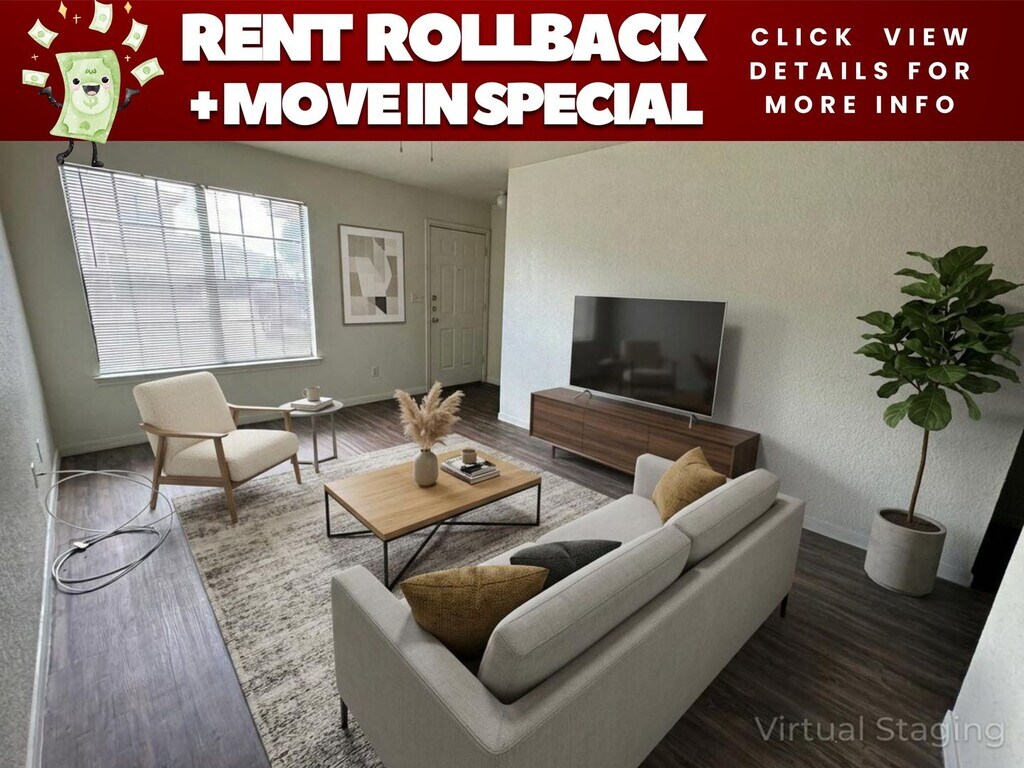 Rent Rollback! Was $850, Now $675. Save $175/month! *Move-in special: Receive $250 off one month of rent when you sign a 1-year lease! Prices and specials are subject to change. See staff for details.* View 360° virtual tour: This 2-bedroom, 1.5-bath townhome-style apartment for rent in Killeen, Texas offers a practical two-story layout with a comfortable mix of vinyl plank and carpet flooring. The kitchen features traditional white appliances, including a dishwasher, along with an in-kitchen dining area. Downstairs, you’ll find the half bath and a laundry room with washer and dryer connections, while both bedrooms and the shared full bathroom are located upstairs for added privacy. Appointments aren’t required to tour. Contact us or stop by our Killeen office to learn more and see this apartment in person once it becomes available! We are located at 1020 W Jasper Dr, Killeen, TX 75642. Disclaimer: The furnishings or enhancements shown are AI-generated and intended for inspiration only. They may not reflect the actual scale, condition, or current features of the property.