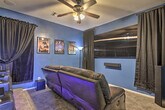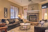 Feel at home in this idyllic 3-bedroom house in Gilbert. This desert tropical oasis features stairs to access the bedrooms on the second floor. The 3,250-square-foot house includes 2.5 bathrooms. This spacious oasis is the perfect spot for a relaxing staycation with friends or family on your next sunny Arizona getaway. The house features a fully equipped kitchen, blender, Keurig coffee maker and grinder, cooking utensils, Crockpot, dishware and flatware, ice maker, microwave, spices, toaster oven, and water filter. Enjoy indoor entertainment with smart TVs, gas fireplaces, ceiling fans, a game room with a ping pong table and pool table, surround sound in the family room, and a theater room. Outdoor amenities include a balcony area with seating, chiminea, furnished patio, hot tub, private saltwater pool, corn hole, tetherball, badminton, shuffleboard, yard games, gas grill, gas fire pit, hammocks, mini putting green, and a private yard with fruit and palm trees. Additional amenities include free Wi-Fi, keyless entry, central air conditioning and heating, hair dryers, hangers, a clothes steamer, in-unit laundry machines, an iron and board, linens and towels, trash bags and paper towels, beach towels and chairs, umbrellas, and four new adult bicycles with two helmets. There is an optional nightly hot tub heat fee of $25, plus fees and taxes, paid pre-trip and applied to the entire stay. The pool heating is available upon request from April to October with an additional daily heat fee charge. Parking is available in the garage for two vehicles, the driveway for one vehicle, and street parking. Community amenities include a basketball court, soccer fields, and outdoor pool access (with pass), near a park, walkways, and bicycle paths. No smoking, pets, events, parties, or large gatherings are allowed. Your safety matters. This property features five exterior security cameras: one camera is located near the front door, one camera is at the back entrance of the home, one camera is at the side entrance, and two cameras face the garage area. The cameras are outward facing and do not look into interior spaces. The cameras record video and sound when activated by motion. Guests will have access to the entire property via keyless entry. [SI]