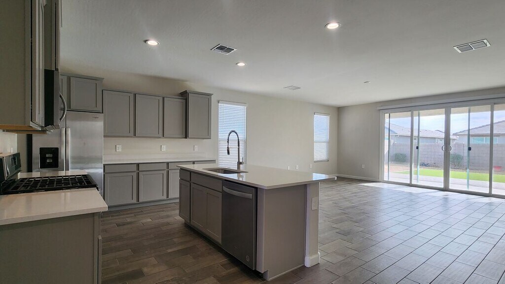 Spacious single level 2258 Sq Ft home that has 4Bd/3Ba, with a split floor plan. As you walk into the front, there is a bedroom and bathroom, next a formal dining room, 2nd hallway has your 2 bedrooms and bathrooms that share a hall bathroom. Kitchen has plenty of upgraded staggered cabinetry, kitchen island, GAS STOVE, plenty of countertop space with a large pantry. All common areas have tile, 3 of the 4 bedrooms have carpet. The primary suite has a large bedroom with a walk in shower, double vanity sinks, large walk in closet. Double sliding doors open to your backyard that has artificial turf and pavers. Plenty of space for entertaining on this large lot. This home has no 2 story neighbors YAY privacy. $2200.00 Refundable Security Deposit, $250.00 Non-Refundable Admin Fee, $50/Application Fee per Applicant 18yrs and older. The monthly rent is $2150/month plus a 1% Monthly Service Fee. Lease term is 12 Month lease only, pets upon lessor approval.** Renters Insurance is required**