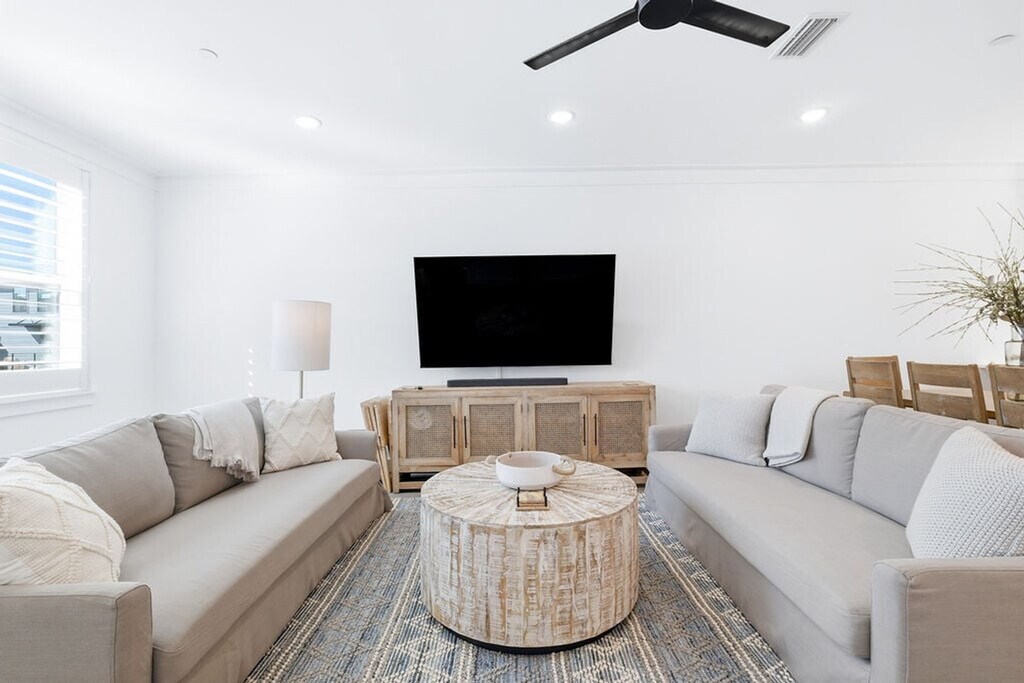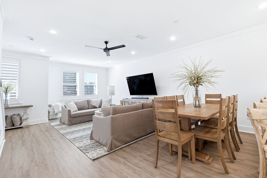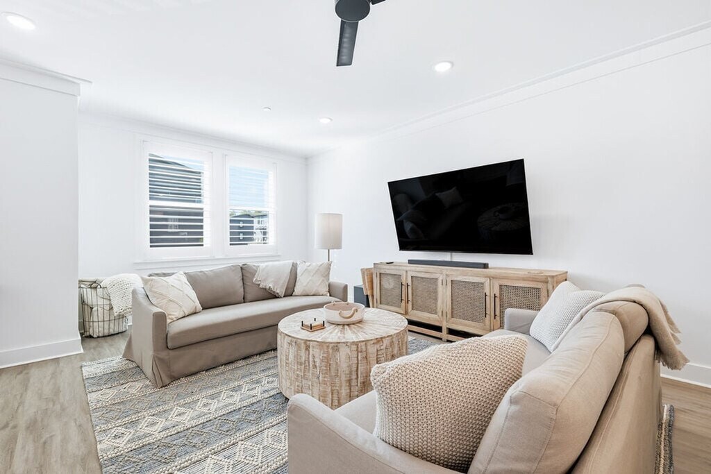 The advertised rate of $3,373/month is the lowest available price, based on a 30 day(s) stay with a move-in date of October 18, 2026. Rates vary depending on the duration of stay, season, and other parameters. For exact pricing and additional pricing components, please visit our website and enter your desired move-in and move-out dates. The rate is applicable when billed upfront; it can be higher if billed in multiple payments. Feel at home in this luxury modern townhome, Booked by the Beach, perfectly situated near the tranquil bay in beautiful Santa Rosa Beach. This upscale three-story retreat offers the ideal balance of serene bay living and quick access to the best of 30A. Designed with luxury, comfort, and functionality in mind, this home makes the perfect coastal getaway. The ground level features a king bedroom with en-suite bathroom, smart TV, and direct access to the screened-in patio. The second floor offers a stylish living room with comfortable seating and a large smart TV, a well-equipped modern kitchen featuring a spacious island with seating for six, a dining area with a large table for six, a convenient guest half bath, a laundry room with full-size washer and dryer, and a private balcony. The third floor includes a queen bedroom with ceiling fan and smart TV, a bedroom with a built-in twin-over-queen bunk, and a primary suite with a king bed, en-suite bath, ceiling fan, and smart TV. One-car garage is available for easy parking and storage. Walton County offers a seasonal tram service for convenient beach access. Located on the peaceful north side of Highway 98, this home offers easy access to North Beach Social, the bayfront, and a short 10-minute drive to Ed Walline Beach Access, along with nearby options such as Dune Allen and Topsail Hill Preserve State Park. It's also close to 30A dining, shopping, trails, and attractions. Pets are not allowed. [SI]