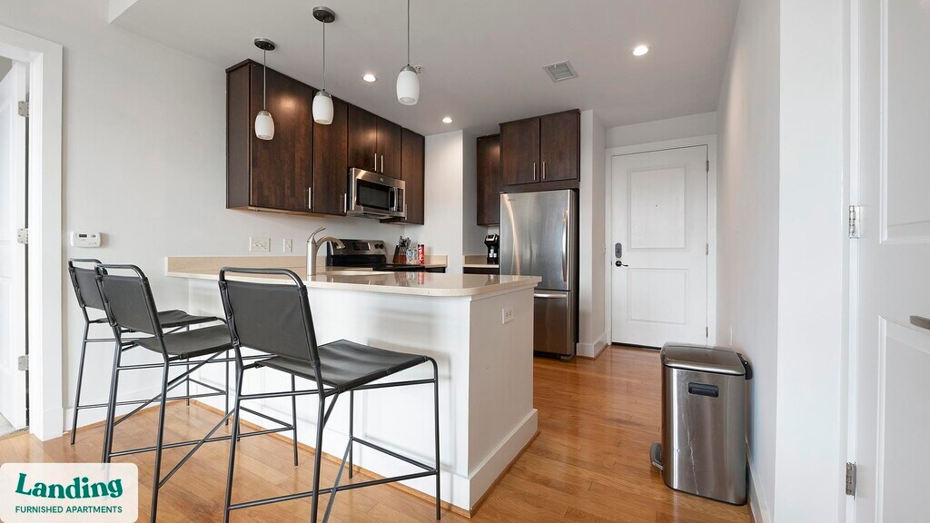 Landing offers flexible lease terms from weeks to months. Please always visit our website or contact us for the latest pricing & availability. Stay longer, save more: 6-Month Minimum base rent: starts at $3210/mo 12-Month Minimum base rent: starts at $2872/mo Landing offers flexible leases across a network of over 35,000 fully-furnished apartments throughout 375+ cities so you can rent on your terms, practically anywhere, and avoid the hassle of paying deposits or application fees. Visit to learn about all the benefits of a Landing membership, see our competitive up-to-date pricing, explore available apartments, take virtual tours, and make reservations online without jumping through traditional rental hoops. Landing's apartments at The Griffin are designed for comfortable, easy living, with the ability to stay as long as you like. Experience living with Landing Every apartment is outfitted with all the modern essentials including: custom-designed furnishings, a fully-equipped kitchen with deluxe stainless steel appliances, a gourmet coffee maker, premium linens, Smart TVs, and incredibly fast, reliable internet for working from home. When you live with Landing, you'll enjoy a hassle-free experience with the added benefit of 24/7 access to our dedicated member experience team. Some of the nitty-gritty: a background check and proof of income are required; we're completely smoke-free; bundled utility packages and pricing vary based on length of stay; pet-friendly options available; listed price reflects a 12-month minimum stay.