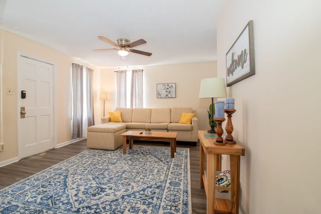 Feel at home in this cozy Columbus half-duplex featuring 2 bedrooms and 1 bathroom in a central location. This cottage accommodates up to 6 guests and is just 15 minutes from downtown and minutes from I-185, which leads right to Fort Moore! Step into this charming cottage and be instantly embraced by an inviting blend of comfort and elegance. The spacious, open-plan living area is thoughtfully designed to ensure a restful and luxurious stay. Settle into the plush sleeper sofa, perfectly positioned for you to indulge in a cinematic treat on the large SmartTV. Adjacent to the living room, you'll discover a chic dining area, seamlessly integrated and perfect for sharing laughter-filled meals. The contemporary kitchen, located just off the dining room, is fully equipped with a stove, oven, microwave, and a full-size fridge. A pack 'n play/travel crib and a vacuum are available upon request. Pets are welcome with a non-refundable pet fee. If there is evidence of pet hair on the furniture, excess hair in the home, stains, or waste found in the yard or home, you will be charged the cost to clean this. This is a very quiet and safe residential neighborhood. There is no public transportation in the neighborhood, so you will need to drive or plan to take a cab/Uber. Pets must be crated when they are left unattended. Pets are not allowed on furniture or beds, and all waste must be cleaned up from the yard. Smoking cigarettes, vapes, e-cigs, pipes, etc., and marijuana are prohibited in or around the home. If our cleaning crew reports any signs of smoking, an automatic $500 damage charge will be incurred. The same charge applies if cigarette butts are found outside of the home. If marijuana is smoked in or around the home a $500 fee will be charged, and details about the reservation may be turned over to the appropriate authorities. Parties are prohibited. To be courteous to our neighbors, quiet hours are between 10 PM and 7AM. If you violate quiet hours and disturb the neighbors, we will cancel your reservation; you will be required to leave the property immediately and you will not be eligible for any refunds. You must be at least 25 years of age to rent this property. You will be responsible for any damage to the home or its furnishings during your stay. Please bag all trash and place it in the bins provided. There is a $100 charge for third party trash removal if an excessive amount of trash is left at the property. The laundry space is shared between all units. Registration Number: STVR-11-23-7541 [SI]