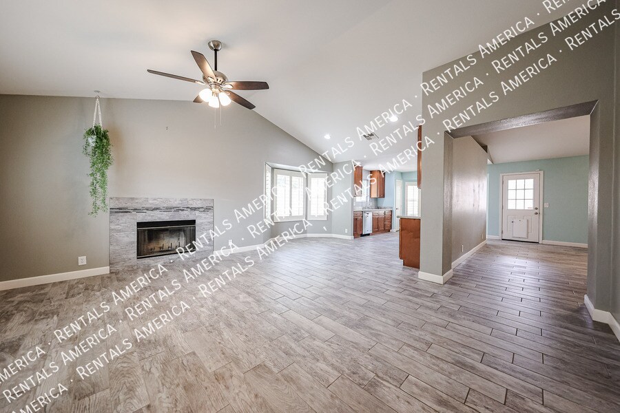 Feel at home with this charming 4-bedroom home that is sure to captivate with its elegant interior, featuring vaulted ceilings, wood shutters throughout and wood-look tile floors. The spacious great room, complete with a cozy fireplace, creates a warm and inviting atmosphere. The kitchen is a cook's delight, equipped with chocolate-stained cabinets, stainless steel appliances, granite counters, a handy pantry, and a delightful bay window. Retreat to the serene main bedroom, offering a private bathroom with dual sinks for convenience. The peaceful backyard is perfect for relaxation, boasting a covered patio, a lush grassy area, and ample space for outdoor activities. *One Time Admin Fee: $300, Pet Deposit: $300/pet (if applicable), Service Fee: 2%. $39/month Resident Benefits Package* Helping Heroes Discount Available! ONE DOG 35LBS OR LESS OKAY. Disposal Dogs Allowed Garage Pets Allowed Vinyl