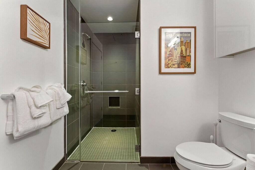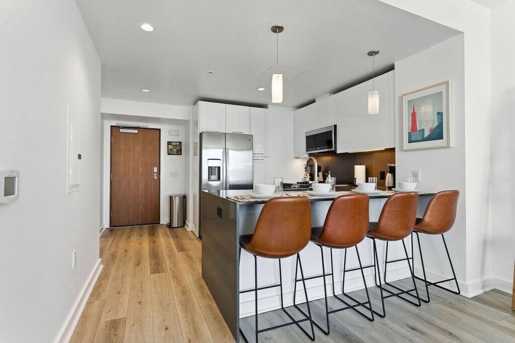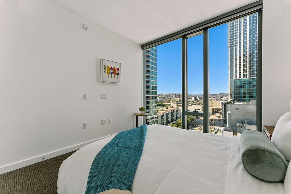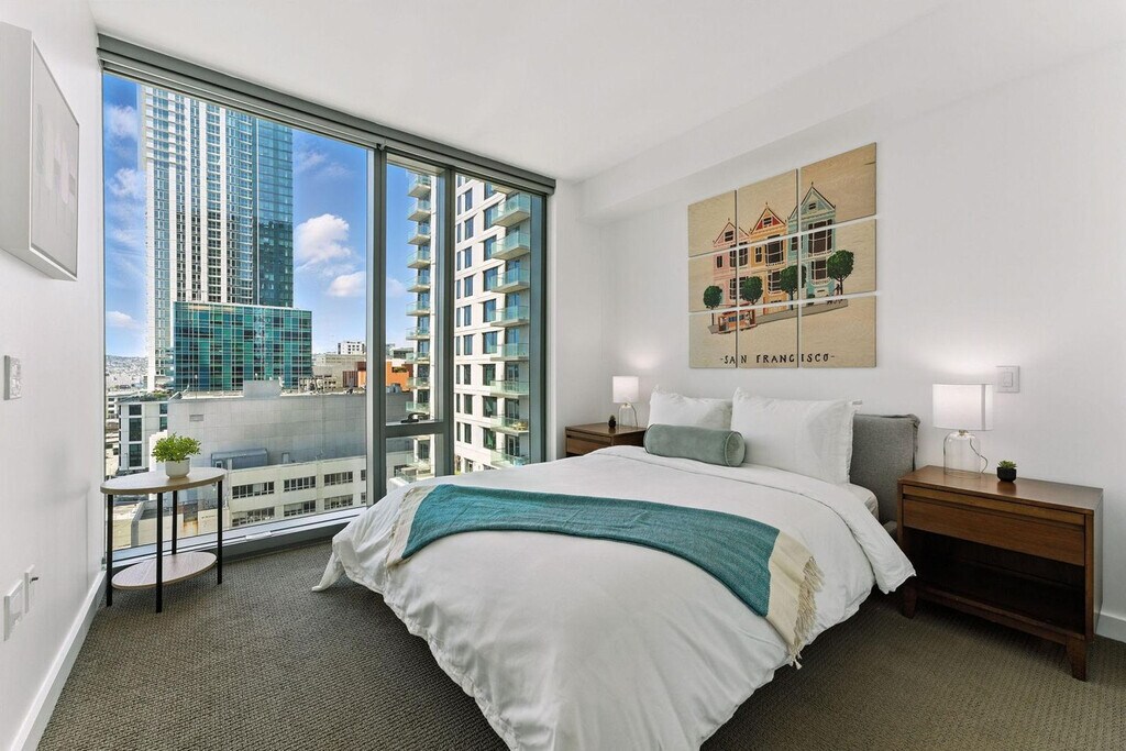 Feel at home in this high-rise, luxury apartment at 399 Fremont, your key to sophistication and convenience in the historic, yet modern neighborhood of Rincon Hill. Towering over the Bay Bridge and only steps from world-class restaurants, galleries, and nightlife, this 1-bedroom apartment on the 42-story skyscraper offers everything you need to work and play from home. Take in a game or concert at Oracle Park, stroll along the Embarcadero to watch the ships go by, or just enjoy the sunlight pouring in from the floor-to-ceiling windows of your living room. From state-of-the-art amenities to ultra-modern and bright living spaces with inspirational views, this fully furnished apartment is custom-designed for the remote worker looking for a comfortable environment in which to be productive. This unit includes a fully equipped kitchen, full bathroom, queen-size mattress, plenty of storage, smart TV, all utilities, stainless steel appliances, hardwood floors, floor-to-ceiling windows, in-unit laundry, walk-in closets, central air conditioning and heating. Secure garage parking is available by request only, based on availability. Guest parking is available at $35/day, a reserved space is $510/month, motorcycle parking is $215/month, and storage is available starting at $175/month. Located in San Francisco’s most desirable new address, this apartment is in the historic, yet modern neighborhood of Rincon Hill. Internet speeds are not guaranteed and may fluctuate based on your computer model and the router location. A laptop computer is not included in the home office set-up. Early check-in from 10am-3pm will incur a fee of $75. Early check-in before 10am will incur a fee of 1 full night's rent (based on selected dates). Late check-out from 11am-3pm will incur a fee of $75. Late check-out after 3pm will incur a fee of 1 full night's rent (based on selected dates). Late check-outs must be requested at least 48 hours in advance. Includes private high-speed internet, standing desk (Uplift), ergonomic work chair (Uplift), 34-inch ultra-wide monitor (Samsung), microphone (Blue Yeti), webcam (Logitech), computer speakers (Bose), LED streaming light, green screen, keyboard (Logitech), mouse (Logitech), laptop stand, and TOTU 16-in-1 Triple Display USB-C 3.1 Docking Station. Partners reserve the right to conduct secure ID verification, background checks and request Proof of Income. Guests will have 24 hours to complete these steps. Booking confirmation is contingent upon the successful completion of these checks, as well as meeting the minimum eligibility requirements. [SI]
