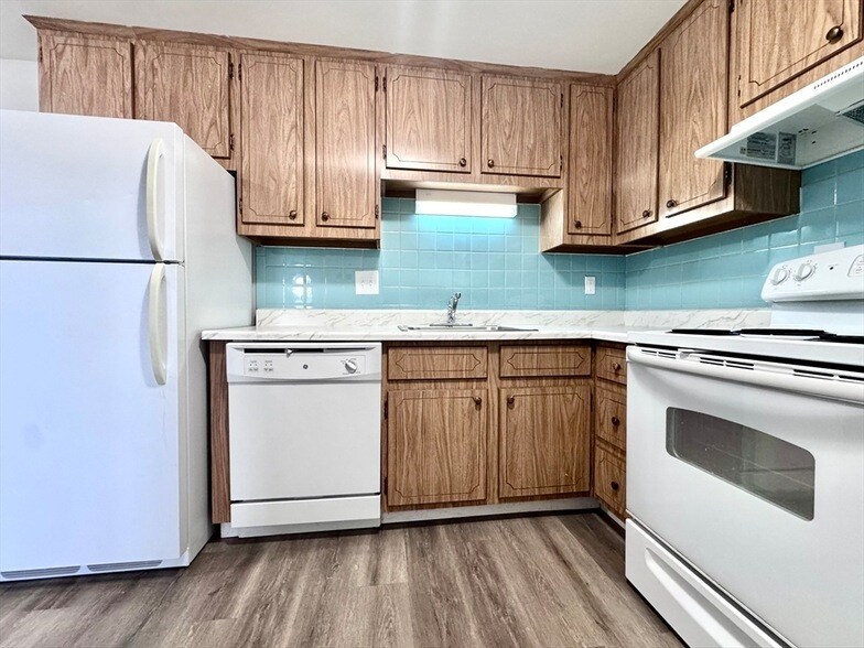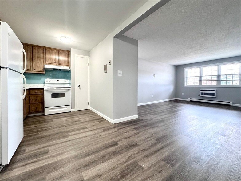 Available Now! This inviting top-floor 1-bed, 1-bath apartment offers comfort, convenience, and style with heat and hot water included! Step into a bright, welcoming living space featuring modern finishes, light brown cabinetry, white appliances, and vinyl flooring throughout for a clean, contemporary feel. The spacious bedroom provides ample closet space and natural light, while a wall-mounted A/C unit ensures year-round comfort. The updated tiled bathroom adds a touch of sophistication, and additional conveniences include on-site, card-operated laundry, a dedicated 4x4 storage bin, and one included common parking space. A cat is welcome at no extra charge, making this home perfect for pet lovers. Located just off Mass Ave, residents enjoy easy access to shops, restaurants, cafes, and public transportation. The property also features a beautifully maintained common courtyard, outdoor seating areas, and bike storage, creating an ideal blend of practicality, comfort, and city living.