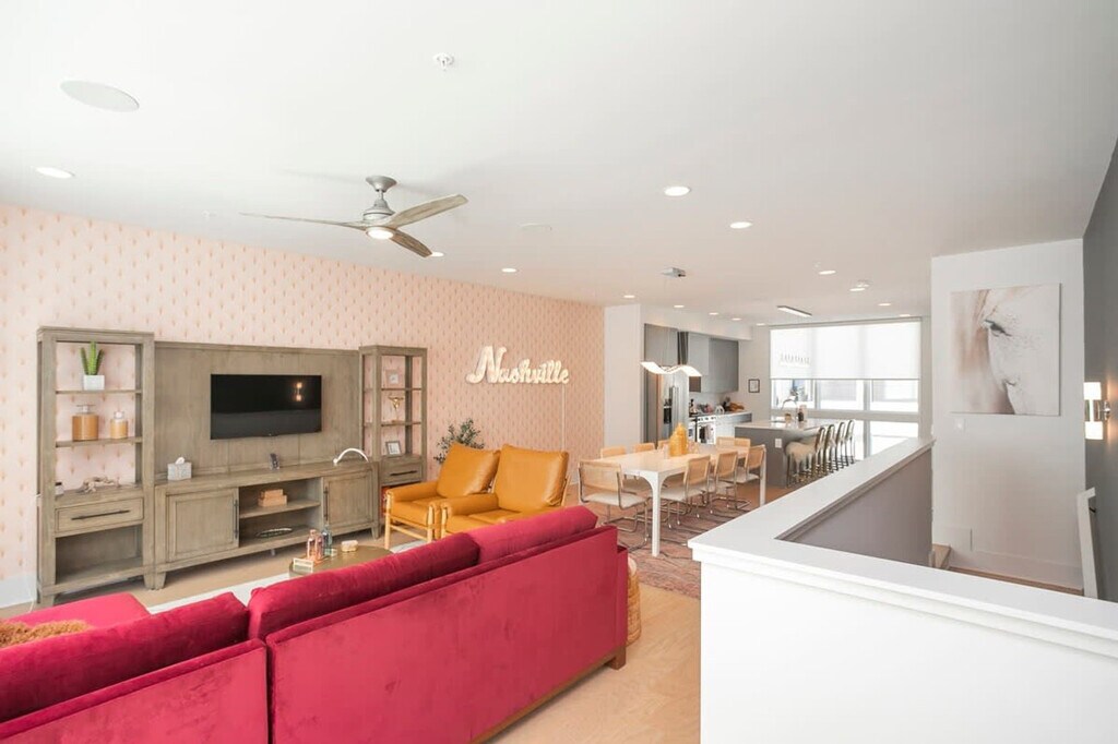 Experience the best of Nashville in this stunning, professionally designed 4-bedroom, 4.5-bathroom haven. Enjoy walkable access to vibrant restaurants, cafes, and shops, with Downtown just a 10-minute drive away. Unwind in the spacious living room, bonus party room with wet bar, or rooftop deck offering breathtaking city views. This apartment includes a two-car garage for guests, perfect for groups seeking a memorable stay. This beautifully designed townhome is both open and inviting, providing ample room for comfort and relaxation. Ideal for large groups celebrating special occasions or creating lasting memories, the townhome features four full bathrooms and a half bathroom, ensuring everyone has ample space to prepare for a night out in Music City. Enjoy upscale amenities that enhance your experience, including a fully equipped kitchen with a gas range and stainless steel appliances, smart TVs in the living areas and bedrooms, and spacious closets. The pièce de résistance is the expansive deck, offering breathtaking views of Nashville’s vibrant landscape. Guests who stay 3 weeks or longer will incur an additional cleaning fee. This is not included in the pricing you see but will be an additional add-on fee. Optional concierge services are available by request, including a stocked refrigerator and in-home chefs. Sylvan Heights is an established and trendy neighborhood located just west of downtown, approximately a 10-minute drive. This home is within walking distance to several Nashville favorites like Edley's, Pancho & Leftys, Star Bagel, Park Cafe, and Sylvan Supply, which includes Punk Wok, Bearded Iris, Ginger Kitchen, coffee shops, and shopping. A golf course is conveniently located across the street. The area is centrally located to go anywhere but also situated in a great spot if you want to hang locally. Smoking is not allowed inside or within 25 feet of the property. A $500 fee will apply if smoke of any kind is detected in the home. Early check-in or late check-outs must be pre-arranged. Any non pre-arranged late check-outs will result in withholding of deposit. The only way to guarantee an early check-in is if the night prior to your stay is available, it can be blocked off for you at half the price. The same goes for late check-out, if there is no one booked the night of your check-out date, the night can be blocked off for a guaranteed late check-out at half the price. Please make sure all doors are shut and locked when not in use and do not leave any valuables in your vehicle if parked on the street. Primary Guest must be 21 years or older. Your photo ID information must match the information on your credit card. The home includes Wi-Fi and smart TVs, providing a comfortable environment for remote work. Registration Number: [SI]