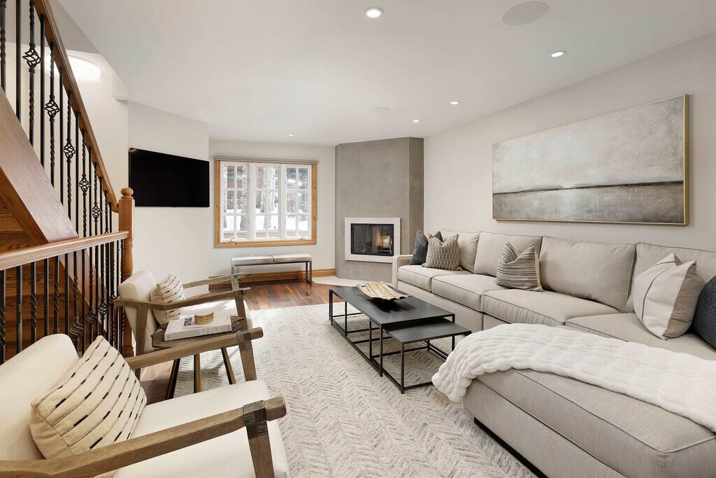 Feel at home in this expansive 4-bedroom, 4.5-bath townhome nestled in the heart of Aspen's Central Core. A short 2-block walk will take you to the gondola and lift 1-A, as well as all the enticing restaurants, vibrant bars, and charming shops Aspen has to offer. Situated in the serene Alpenblick Townhomes, this European-inspired townhome invites you to relax and unwind. The kitchen is well-appointed with everything needed to prepare delicious home-cooked meals, including quartzite countertops, a spacious dining table with seating for six, additional seating for two at the bar, and a wine cooler. Enjoy the convenience of a year-round heated pool, hot tub, BBQ area, and private ski locker on the premises. The living area features a spacious open layout, comfortable sofa and chairs, a cozy wood-burning fireplace (firewood provided), a smart TV with streaming services and Xfinity cable, and a powder room. All beds are made with luxury 100% cotton linens from Garnier-Thiebaut. In the bathrooms, soft white towels, plush robes, hairdryers, and premium toiletries are provided. This property also features central air conditioning throughout, high-speed Wi-Fi, a built-in Sonos speaker system, ample closet and in-unit storage, and a washer/dryer. Parking for one vehicle is available at the building. Additional street parking is available with a provided residential parking pass. Located in the heart of Downtown Aspen, this apartment is within walking distance to everything Aspen has to offer, including the gondola, restaurants, shopping, nightlife, and many hiking trails. The Ruby Park Transit Center offers convenient, complimentary bus service to the other three mountains (Aspen Highlands, Buttermilk, and Snowmass), as well as to the Aspen Airport. You can also ride downvalley to popular destinations like the Glenwood Hot Springs. In the summer months, shuttles provide easy access to the Aspen Music Festival tent. The third and fourth bedrooms each have a king-size bed that can be converted to two twins upon request. Plush down pillows are standard; if you have allergies, a down alternative can be provided upon request. The second and fourth bedrooms each include a desk and chair for those who need to work remotely.