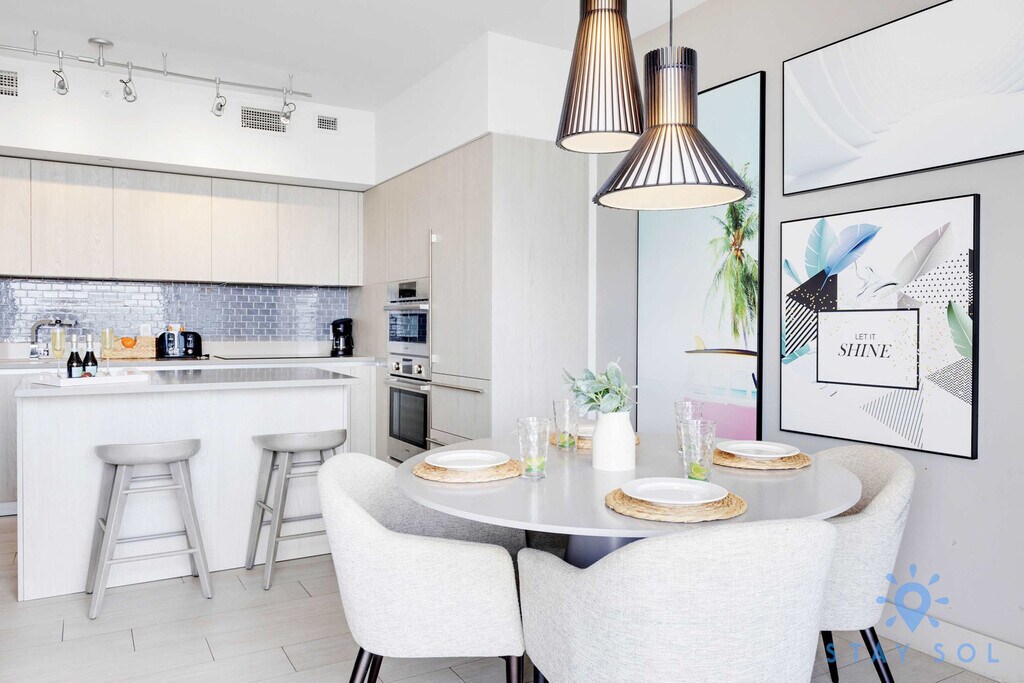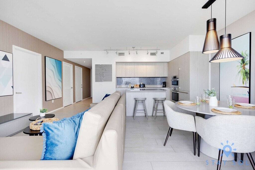 Feel at home in this brand new luxury condo in front of Hollywood Beach. This 15th-floor, 1-bedroom bay view unit features a full kitchen, 1.5 bathrooms, and a balcony with a stunning view. This well-appointed apartment mixes natural wood and stone with organic textures and state-of-the-art technology. Highlights include a fully equipped kitchen with a stainless steel refrigerator/freezer, glass stove, integrated oven, silent dishwasher, integrated microwave, stove, dishes, coffee maker, hairdryer, electronic safe, iron/ironing board, in-suite washer/dryer, and TVs in each room. Enjoy a panoramic view of the bay from the large balcony and plenty of sunlight during the day. Amenities include two infinity-edge ocean and bay view pools, a sundeck, private cabanas, a fitness center, and a hot tub. Valet parking is available for a fee of $40 nightly for 1–6 nights, $15 nightly ($105 weekly) for 7–29 nights, and $9.33 nightly ($280 monthly) for 30+ nights. A pack’n play crib is available for free upon request. Just beyond the resort, you'll find the Hollywood Beach boardwalk and miles of Blue Wave-designated beaches. Surrounded by lots of restaurants and the world-famous Gulfstream Park, where you can dine, enjoy horse races, or try your luck at the casino five minutes away. To the west, you can visit the famous colossal Hard Rock Guitar Hotel & Casino, which is the perfect location to be on the beach if you are attending an event at Hard Rock Stadium. To the south, you can continue to the renowned Aventura Mall, or head to South Beach for adventurous nightlife. To the north, you can enjoy more shopping and restaurants in the city of Fort Lauderdale. This apartment is minutes from Fort Lauderdale Airport. For groceries, you will find a 24-hour Walmart right next door and a Publix Supermarket a two-minute drive away. Swimming is at your own risk; there is no lifeguard on duty. Children must be supervised by a responsible adult at all times. Please keep all doors closed and the air conditioning on at all times to help prevent condensation and property damage. [SI]