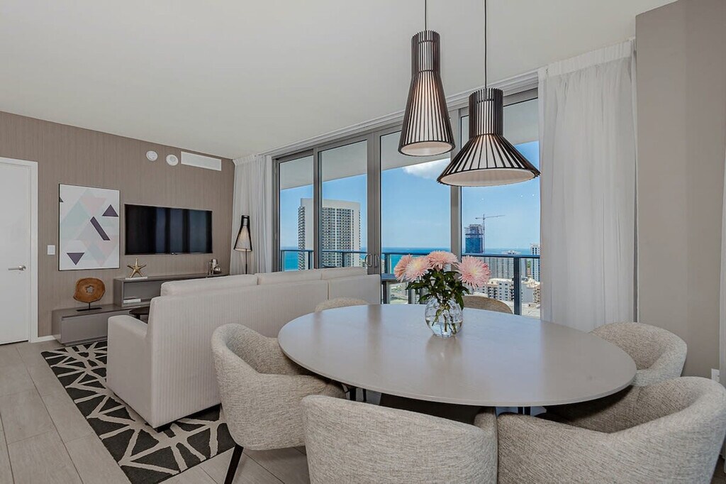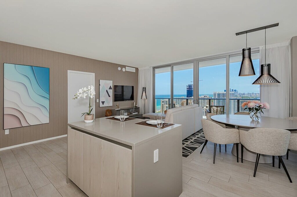 The advertised rate of $8,239/month is the lowest available price, based on a 30 day(s) stay with a move-in date of August 24, 2026. Rates vary depending on the duration of stay, season, and other parameters. For exact pricing and additional pricing components, please visit our website and enter your desired move-in and move-out dates. The rate is applicable when billed upfront; it can be higher if billed in multiple payments. Feel at home in this brand new luxury condo in front of Hollywood Beach, a few minutes' drive to Aventura Mall and Sunny Isles Beach. Located on a high floor, this 3-bedroom unit features bay and ocean views. This well-appointed apartment mixes natural wood and stone with organic textures and state-of-the-art technology. Highlights include a full kitchen and a large corner balcony to enjoy a panoramic view of the bay and the ocean. The fully equipped kitchen offers a stainless steel refrigerator/freezer, glass stove, integrated oven, silent dishwasher, integrated microwave, stove, dishes, coffee maker, hairdryer, electronic safe, iron/ironing board, in-suite washer/dryer, and TVs in each room. Amenities include two infinity-edge ocean and bay view pools, a sundeck, private cabanas, a fitness center, and a hot tub. Valet parking is available for a fee of $42 nightly for 1–6 nights, $15 nightly ($105 weekly) for 7–29 nights, and $9.33 nightly ($280 monthly) for 30+ nights. A pack’n play crib is available free upon request. Just beyond the resort, you'll find the Hollywood Beach boardwalk and miles of Blue Wave-designated beaches. Surrounded by lots of restaurants and the world-famous Gulfstream Park, where you can dine, enjoy horse races, or try your luck at the casino five minutes away. To the west, you can visit the famous colossal Hard Rock Guitar Hotel & Casino, and it is the perfect location to be on the beach if you are attending an event at Hard Rock Stadium. To the south, you can continue to the renowned Aventura Mall, or if you feel like going on an adventurous nightlife, you can head to South Beach to party all night. To the north, you can enjoy more shopping and restaurants in the city of Fort Lauderdale. This apartment is minutes from Fort Lauderdale Airport. For groceries, you will find a 24-hour Walmart right next door and a Publix Supermarket two minutes' drive away. [SI]
