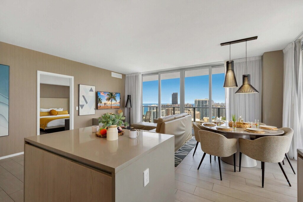 The advertised rate of $8,374/month is the lowest available price, based on a 30 day(s) stay with a move-in date of August 18, 2026. Rates vary depending on the duration of stay, season, and other parameters. For exact pricing and additional pricing components, please visit our website and enter your desired move-in and move-out dates. The rate is applicable when billed upfront; it can be higher if billed in multiple payments. Feel at home in this brand new luxury condo in front of Hollywood Beach, offering stunning bay and ocean views from a high floor. This 3-bedroom unit features 2.5 bathrooms and a balcony. This well-appointed apartment mixes natural wood and stone with organic textures and state-of-the-art technology. Highlights include a fully equipped kitchen with stainless steel refrigerator/freezer, glass stove, integrated oven, silent dishwasher, integrated microwave, stove, dishes, and coffee maker. Additional amenities include a hairdryer, electronic safe, iron/ironing board, in-suite washer/dryer, and TVs in each room. Amenities include two infinity-edge ocean and bay view pools, a sundeck, private cabanas, a fitness center, and a hot tub. Valet parking is available for a fee of $42 nightly for 1–6 nights, $15 nightly ($105 weekly) for 7–29 nights, and $9.33 nightly ($280 monthly) for 30+ nights. A pack’n play crib is available free upon request. Just beyond the apartment, you'll find the Hollywood Beach boardwalk and miles of Blue Wave-designated beaches. Surrounded by lots of restaurants and the world-famous Gulfstream Park, you can dine, enjoy horse races, or try your luck at the casino five minutes away. To the west, you can visit the famous colossal Hard Rock Guitar Hotel & Casino and is the perfect location to be on the beach if you are attending an event at Hard Rock Stadium. To the south, you can continue to the renowned Aventura Mall, or head to South Beach for nightlife. To the north, you can enjoy more shopping and restaurants in the city of Fort Lauderdale. A 24-hour Walmart is right next door for groceries, and a Publix Supermarket is a two-minute drive away. Swimming is at your own risk, as there is no lifeguard on duty. Children must be supervised by a responsible adult at all times. Please keep all doors closed and the air conditioning on at all times to help prevent condensation and property damage. [SI]