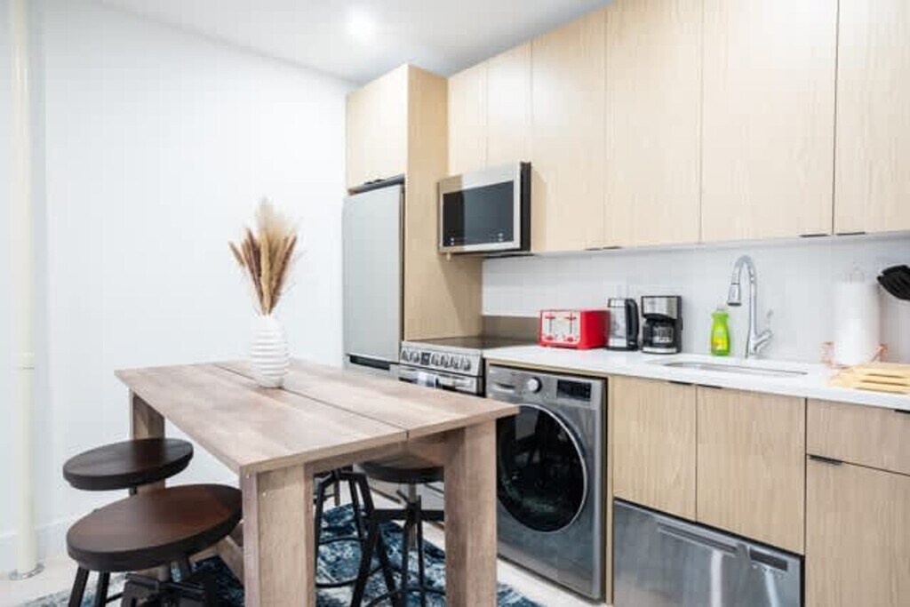 This exquisite furnished apartment is a recently built 2-bedroom home situated in the highly desirable East Village neighborhood. The apartment features a snug layout that has undergone a comprehensive renovation, resulting in a lavish and sophisticated ambiance. Thoughtfully chosen decor adds an elegant and inviting atmosphere. Fully furnished and accessorized, this apartment is the perfect choice for those in search of a chic and cozy place to live. The apartment is fully equipped with all the amenities you might desire or require during your stay in NYC. It includes a washer and dryer, dishwasher, a 50" HD TV, and memory foam mattresses to ensure your convenience and comfort. Whether you want to relax on your plush sofa and enjoy movies, everything you need is right here. The Lower East Side, an electrifying neighborhood, juxtaposes gritty alleys and tenement-style buildings with upscale apartments and stylish boutiques. After dark, it becomes a magnet for the hip and young, attracting them to trendy bars, music venues, and restaurants. The neighborhood's rich heritage is preserved through the Streets of the Lower East Side Museum, local shops, and iconic establishments like Katz's and Russ & Daughters, offering a true taste of its history and more!