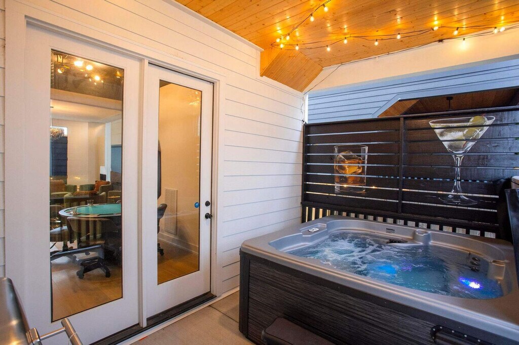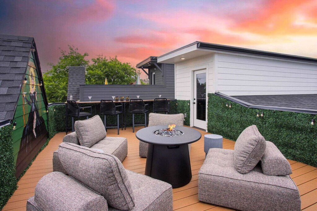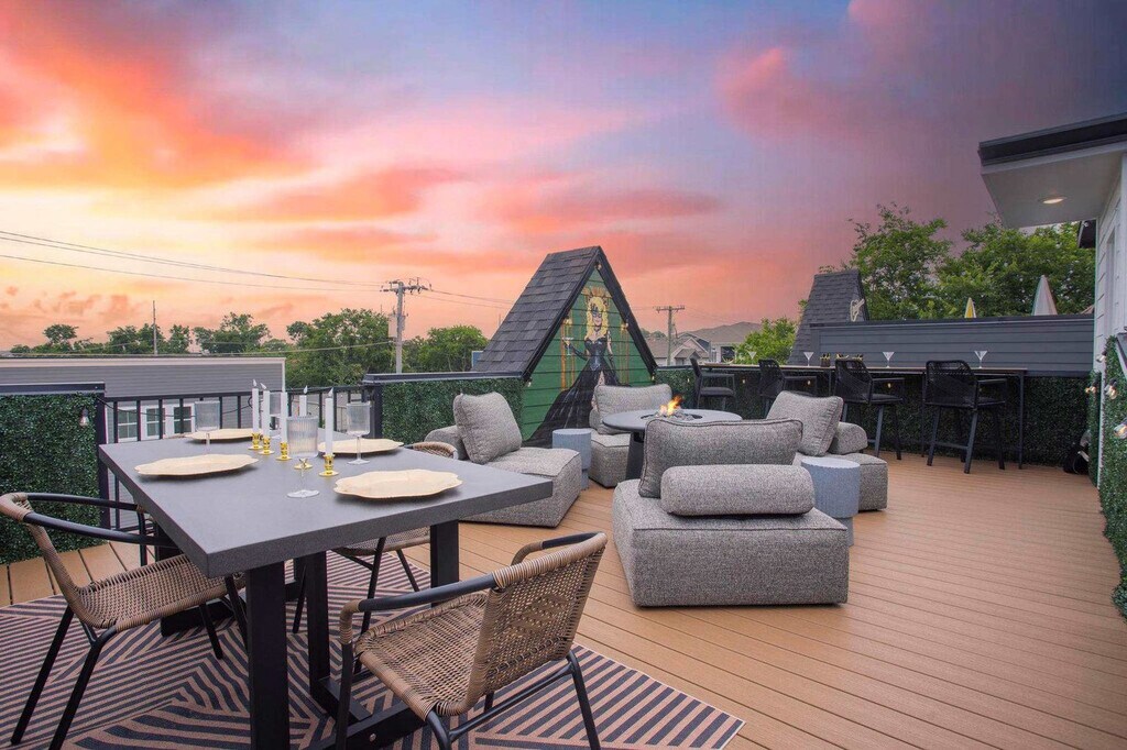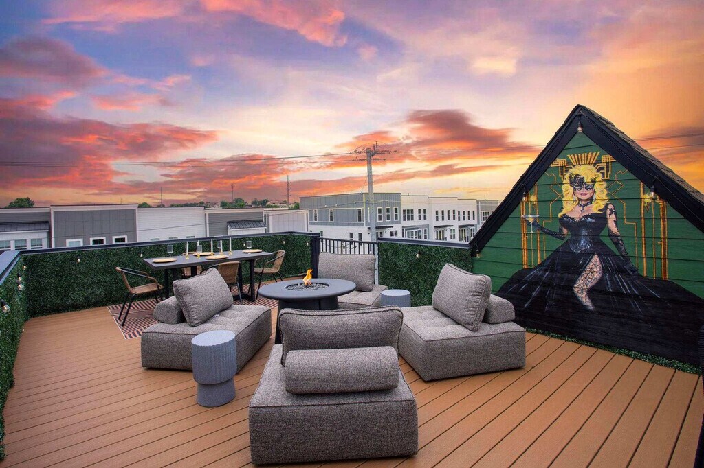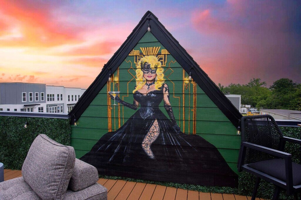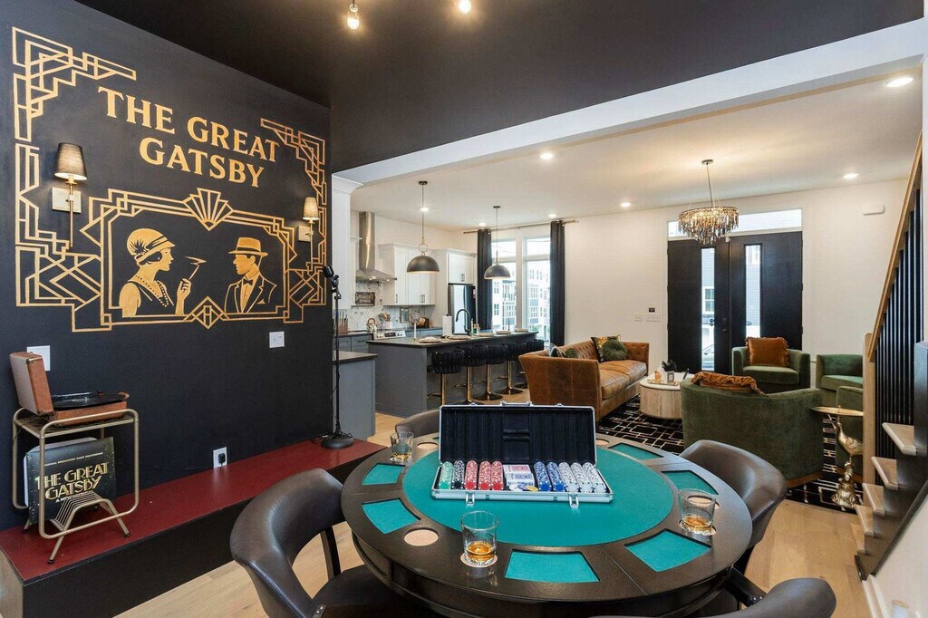 Step into 1920s glamour at this stunning speakeasy-inspired retreat! This elevated 4-bedroom, 3-bathroom home boasts a unique round king bed, custom Dolly Parton mural, mini faux stage, and poker table. Unwind in the private patio with hot tub and grill, or head up to the rooftop deck with comfortable seating, fire pit, and gorgeous views. Located just 5 miles from Broadway in the trendy Nations near Sylvan Park, this home is thoughtfully designed for groups of 10 seeking Nashville charm with Great Gatsby elegance. On the first level, you'll find a full-sized bed with an en-suite full bathroom featuring a shower/tub combo, a fully stocked brand new kitchen, a living room, a poker area with a stage, and an outdoor patio with a hot tub and picnic tables. The second level includes a queen-sized bed, a Jack and Jill full bathroom with a shower/tub combo, and another queen-sized bed. The third level offers a king bed and two twin hotel-style rollaway beds with an en-suite full bathroom, walk-in shower, double vanity, and large walk-in closet. The rooftop deck features a wet bar, fire-table, and soft seating. The Nations/Sylvan Park neighborhood is located 10 miles southwest of downtown Nashville, brimming with locally-owned restaurants, bars, and shops. It's less than a mile from a variety of restaurants, shops, and cafes, and just half a mile from popular spots like Fat Bottom Brewing, Double Dogs, Five Points Pizza, L & L Market, Bearded Iris Brewing, and Another Broken Egg Cafe in Sylvan Heights. Nearby attractions include Sylvan Park and McCabe Golf Course, Broadway/Bridgestone, Music Row, 12 South, and the Grand Ole Opry. The BNA Airport is just 23 minutes away, and Lyft and Uber are readily available for convenient transportation. Unapproved visitors, events, or parties may result in early checkout and additional fees of $500 or more. Exterior cameras are used for safety and property protection. No glitter or confetti is allowed, and decorations should not be placed on wallpaper. Smoking is not allowed inside or within 25 feet of the property, and a $500 fee will apply if smoke of any kind is detected in the home. Early check-ins or late check-outs must be pre-arranged, and non pre-arranged late check-outs will result in withholding of deposit. The only way to guarantee an early check-in or late check-out is if the night prior or after your stay is available, which can be blocked off at half the price. We won't be on-site but are available 24/7 for assistance. Registration Number: