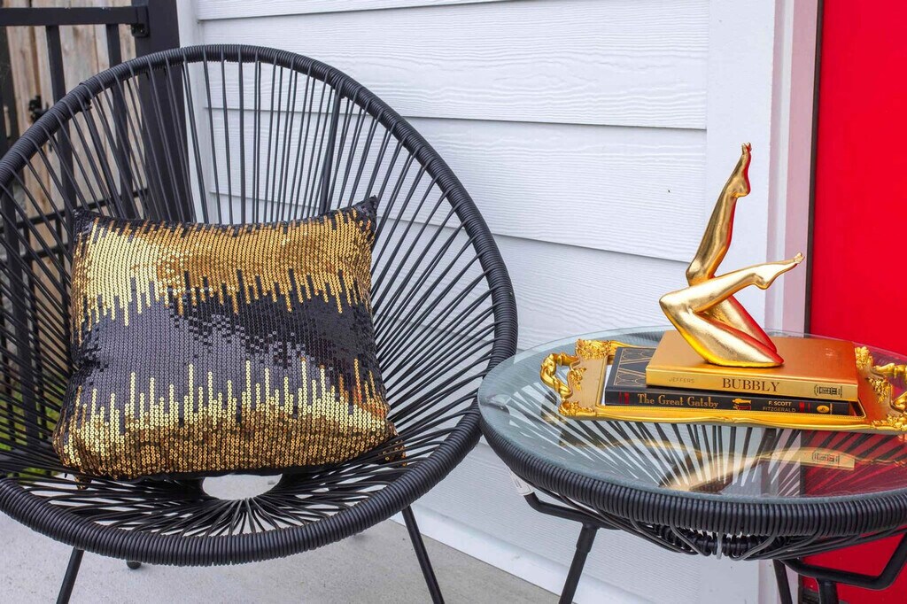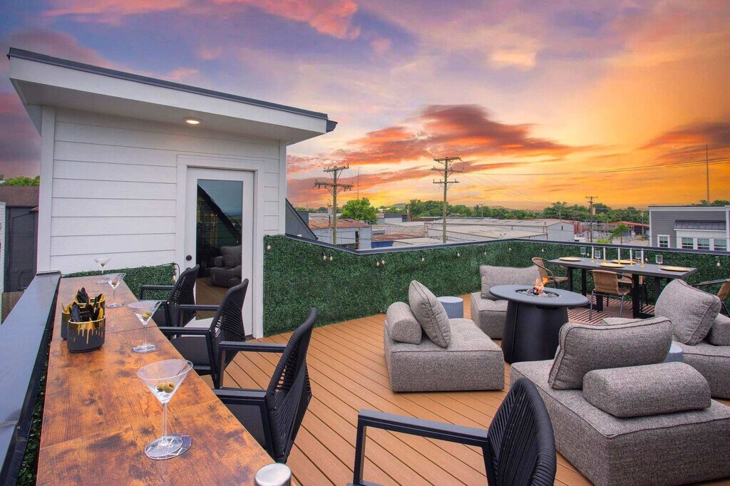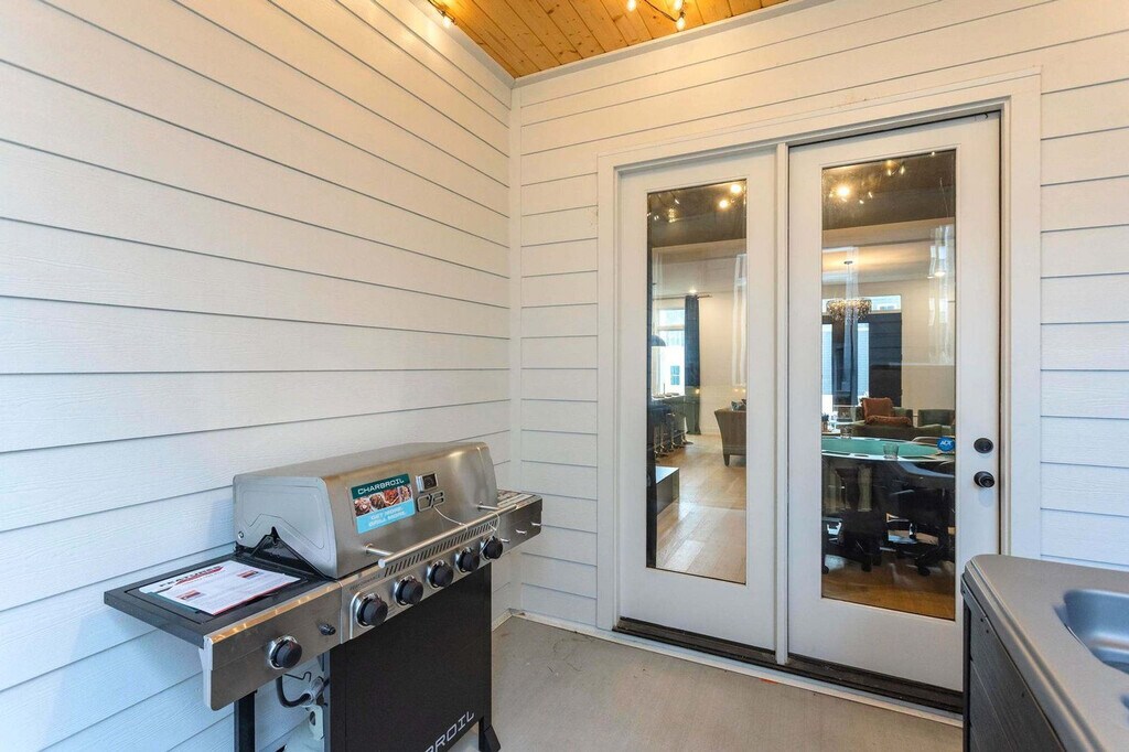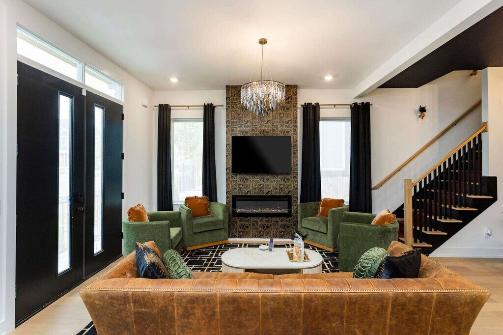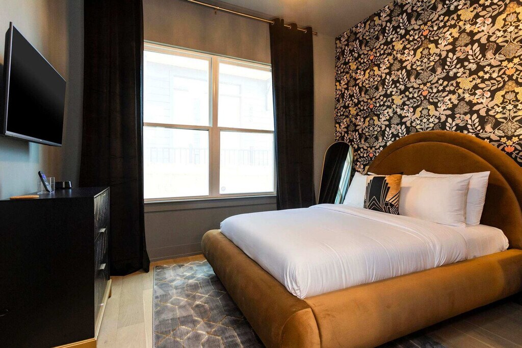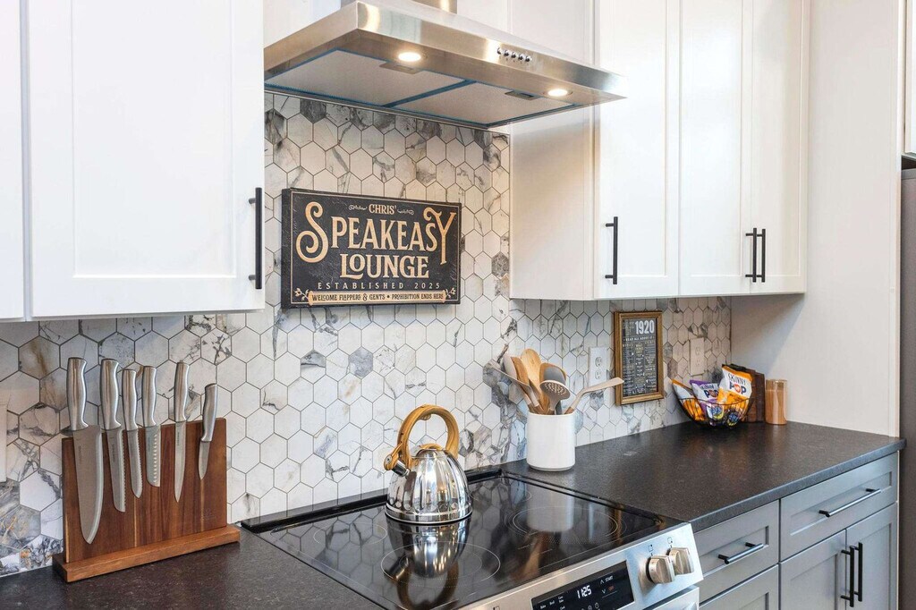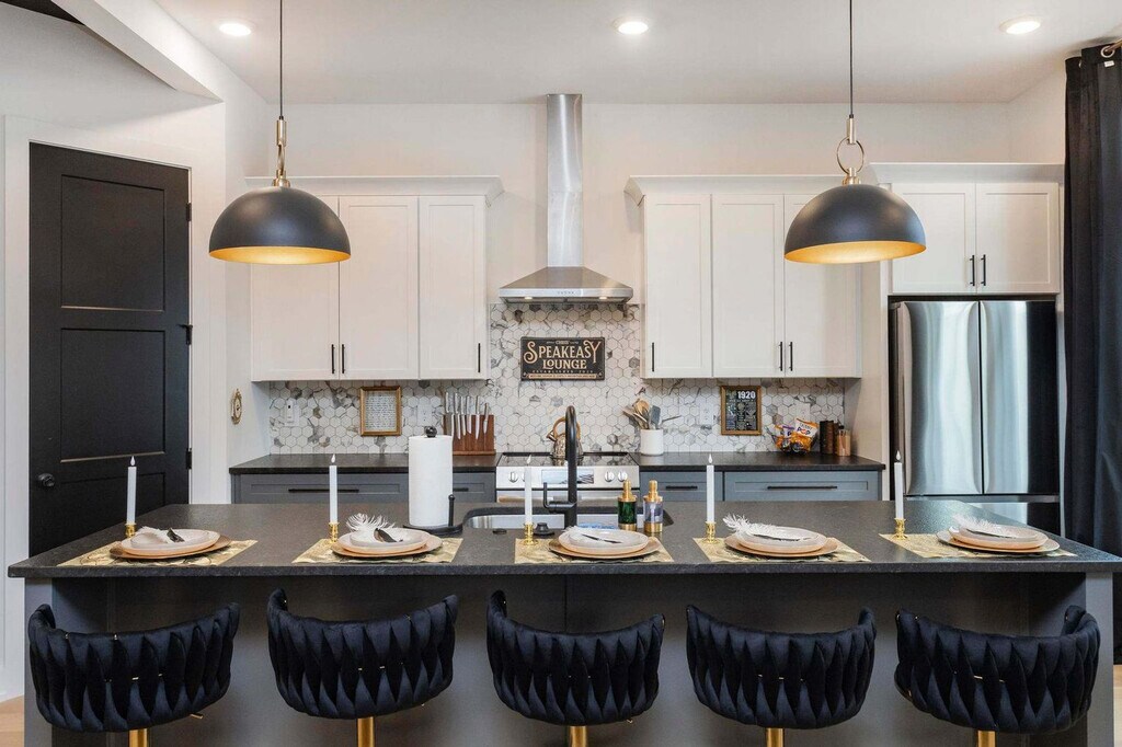 Step into 1920s glamour at this stunning speakeasy-inspired retreat! This elevated 4-bedroom, 3-bathroom home boasts a unique round king bed, custom Dolly Parton mural, mini faux stage, and poker table. Unwind in the private patio with hot tub and grill, or head up to the rooftop deck with comfortable seating, fire pit, and gorgeous views. Located just 5 miles from Broadway in the trendy Nations near Sylvan Park, this home is thoughtfully designed for groups of 10 seeking Nashville charm with Great Gatsby elegance. On the first level, you'll find a full-sized bed with an en-suite full bathroom featuring a shower/tub combo, a fully stocked brand new kitchen, a living room, a poker area with a stage, and an outdoor patio with a hot tub and picnic tables. The second level includes a queen-sized bed, a Jack and Jill full bathroom with a shower/tub combo, and another queen-sized bed. The third level offers a king bed and two twin hotel-style rollaway beds with an en-suite full bathroom, walk-in shower, double vanity, and large walk-in closet. The rooftop deck features a wet bar, fire-table, and soft seating. The Nations/Sylvan Park neighborhood is located 10 miles southwest of downtown Nashville, brimming with locally-owned restaurants, bars, and shops. It's less than a mile from a variety of restaurants, shops, and cafes, and just half a mile from popular spots like Fat Bottom Brewing, Double Dogs, Five Points Pizza, L & L Market, Bearded Iris Brewing, and Another Broken Egg Cafe in Sylvan Heights. Nearby attractions include Sylvan Park and McCabe Golf Course, Broadway/Bridgestone, Music Row, 12 South, and the Grand Ole Opry. The BNA Airport is just 23 minutes away, and Lyft and Uber are readily available for convenient transportation. Unapproved visitors, events, or parties may result in early checkout and additional fees of $500 or more. Exterior cameras are used for safety and property protection. No glitter or confetti is allowed, and decorations should not be placed on wallpaper. Smoking is not allowed inside or within 25 feet of the property, and a $500 fee will apply if smoke of any kind is detected in the home. Early check-ins or late check-outs must be pre-arranged, and non pre-arranged late check-outs will result in withholding of deposit. The only way to guarantee an early check-in or late check-out is if the night prior or after your stay is available, which can be blocked off at half the price. We won't be on-site but are available 24/7 for assistance. Registration Number: