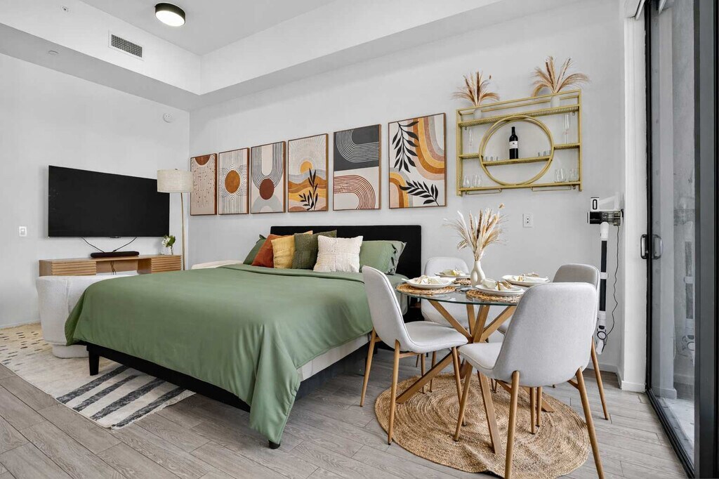 The advertised rate of $8,180/month is the lowest available price, based on a 1 month(s) stay with a move-in date of June 29, 2026. Rates vary depending on the duration of stay, season, and other parameters. For exact pricing and additional pricing components, please visit our website and enter your desired move-in and move-out dates. The rate is applicable when billed upfront; it can be higher if billed in multiple payments. Feel at home in this modern luxury studio on the 32nd floor, offering sweeping Downtown Miami skyline views through floor-to-ceiling windows. Designed for comfort, productivity, and flexibility, this residence blends hotel-level amenities with apartment-level freedom. It features a king-size bed, a 65-inch smart HDTV with cable and streaming apps, a fully equipped kitchen with stainless steel appliances, cookware, utensils, and dishware, and an in-unit washer and dryer. The kitchen also includes a coffee and tea set-up, blender, toaster, and dishwasher. Guests have access to a swimming pool, hot tub, fully equipped fitness center, rooftop lounge, BBQ grill and outdoor kitchen. Secure garage parking is available for one vehicle, and an EV charging station is available in the building garage. Downtown Miami’s Central Business District sits between Biscayne Bay and Brickell’s Financial District, offering walkability, transit access, dining, shopping, and cultural attractions just steps away. Bayside Marketplace, Bayfront Park, Kaseya Center, Whole Foods, and Metromover stations are all within walking distance. The Brickell Financial District, Brightline at MiamiCentral, Pérez Art Museum Miami, Frost Museum of Science, and PortMiami are just minutes away. Wynwood and the Design District are approximately 10 minutes away, Miami Beach is 15–20 minutes away, and Miami International Airport is approximately 15 minutes away. As this is a true downtown high-rise, occasional city noise typical of urban environments may be present. Quiet hours are from 10:00 PM to 7:00 AM, and rooftop pool hours are from 9:00 AM to 9:00 PM. Includes a dedicated desk workspace and a docking station with an external monitor. [SI]