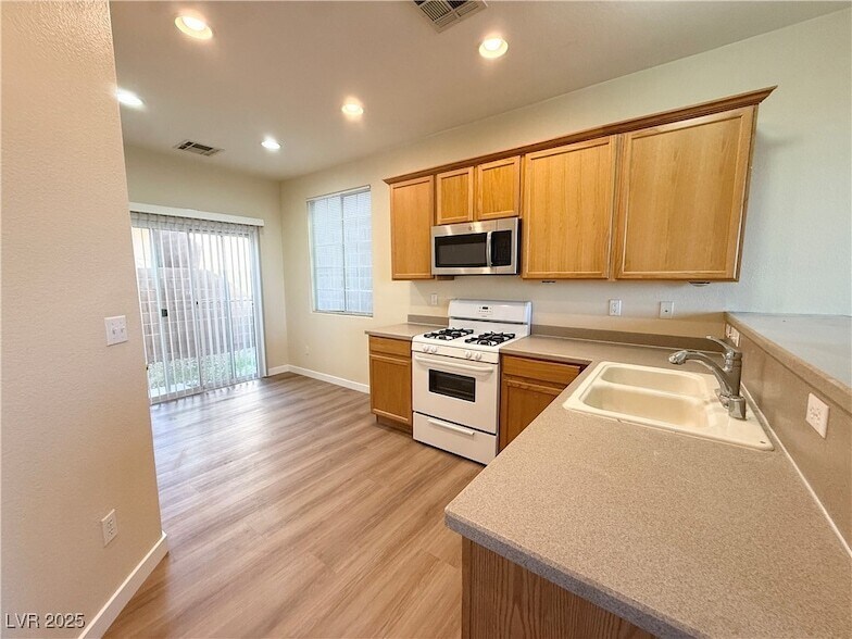 Beautifully remodeled 4-bedroom home located in a gated Northwest community! LVP wood flooring on the first level, new carpet upstairs. Featuring a spacious layout with a breakfast bar kitchen and all appliances included. The primary bedroom offers a separate tub and shower for added comfort. Strip and Las Vegas valley view from second and third bedrooms. Enjoy a no-maintenance yard perfect for easy living.