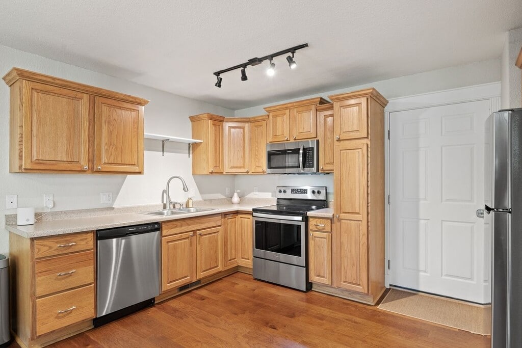 Welcome to your new home in the pines! This charming two-bedroom condo, built in 2006, offers a perfect blend of comfort and convenience, making it an excellent choice for those seeking a cozy home in a beautiful setting. Key property features include an open-concept kitchen equipped with stainless steel appliances, a spacious living room adorned with hardwood floors and a decorative fireplace, and a modern bathroom with dual sinks. Enjoy the added convenience of in-unit laundry with a washer and dryer, alongside a spacious outdoor deck perfect for entertaining and unwinding in nature. This unit provides garage parking for a reasonable sized car, central heating and cooling, and ceiling fans throughout for year-round comfort. Don't miss the chance to make this lovely condo your new home—schedule a viewing today!