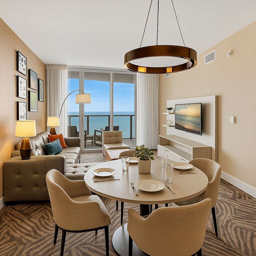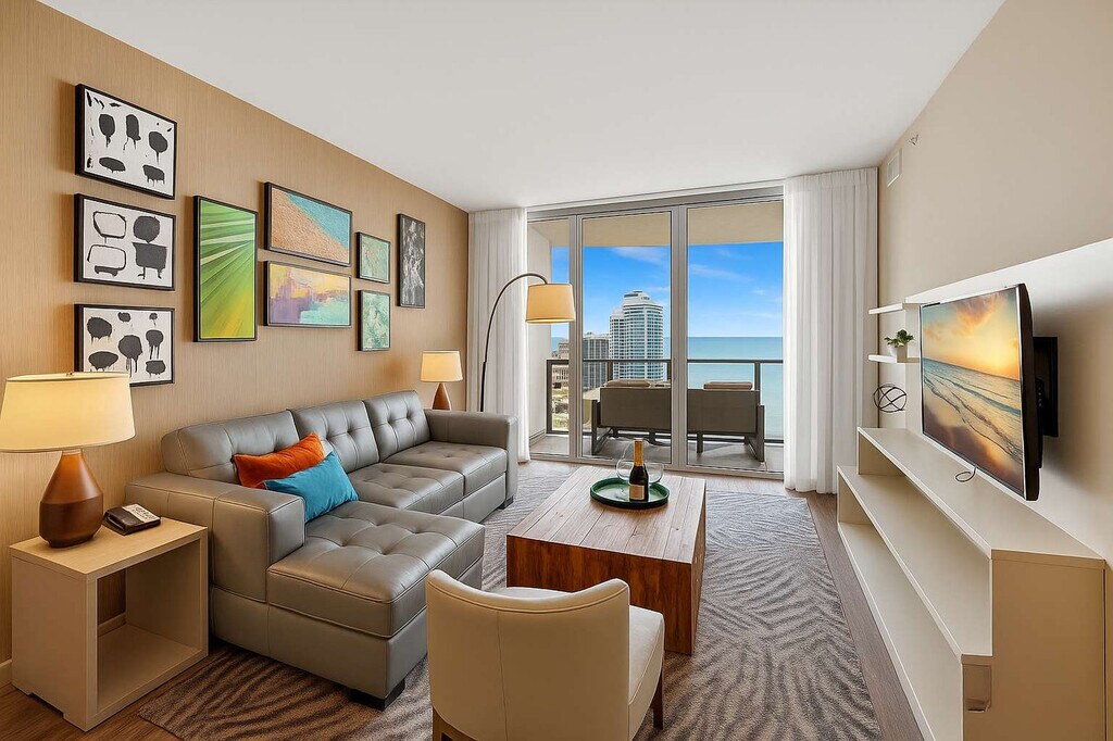 Feel at home in this luxury 1-bedroom condo located in Lyfe Resort and Residence, in front of Hollywood Beach. This ocean-view unit offers a full kitchen, one bathroom, and a balcony. This well-appointed apartment mixes natural wood and stone with organic textures and state-of-the-art technology. Highlights include a fully equipped kitchen with a stainless steel refrigerator/freezer, glass stove, integrated oven, silent dishwasher, integrated microwave, stove, dishes, coffee maker, hairdryer, iron/ironing board, and an in-suite washer/dryer. There are TVs in each room. A pack-n-play crib is available upon request. Package service is available Mondays to Sundays (8 AM - 4 PM) for $5.5 per package. After-hours package service is available for $27.5 per package. Valet parking is available for 1 to 7 days at $35 per day, 8 or more days at $30 per day, a monthly rate at $650 per month, and stays of 6 months or more at $480 per month. Just beyond the resort, you'll find the Hollywood Beach boardwalk and miles of Blue Wave-designated beaches. Surrounded by lots of restaurants and the world-famous Gulfstream Park, where you can dine, enjoy horse races, or try your luck at the casino five minutes away. To the west, you can visit the famous colossal Hard Rock Guitar Hotel & Casino, and it is the perfect location to be on the beach if you are attending an event at Hard Rock Stadium. To the south, you can continue to the renowned Aventura Mall, or if you feel like going on an adventurous nightlife, you can head to South Beach to party all night. To the north, you can enjoy more shopping and restaurants in the city of Fort Lauderdale. The apartment is minutes from Fort Lauderdale Airport. Nearby construction may be audible on weekdays during daytime hours. This apartment is built with impact glass doors, ensuring that when you’re ready to unwind, simply close the balcony doors and you’ll enjoy a calm, quiet space once again. Please keep all doors closed and the air conditioning on at all times to help prevent condensation and property damage. [SI]