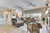 Feel at home in 'Anthem Oasis,' a 3-bedroom, 2.5-bath vacation rental situated on the 10th hole of the Persimmon Golf Course, boasting panoramic mountain views and wide-open spaces. This home features high-end modern furnishings with a sectional sofa, a fireplace, and a 65-inch flat-screen Smart TV. The fully equipped kitchen includes cooking basics, granite countertops, a breakfast bar, a Keurig coffee maker, a tea kettle, and a Crock-Pot. You'll also find linens, towels, complimentary toiletries, trash bags, paper towels, a washer/dryer, central heating and A/C, and beach towels, chairs, and an umbrella. Garage parking for one vehicle and driveway parking for two vehicles are available. Bring the family to this Anthem home for a luxury desert retreat, surrounded by golf course views and Southwest scenes from surrounding trails. You'll love spending the days in the backyard featuring a patio with a gas grill, a dry bar, a private pool, a brand new hot tub, and an outdoor kiva fireplace with a covered patio and sectional lounge chair. Whether you choose to golf at Dove Valley, shop at the Outlets at Anthem, or go on a scenic hike, this home will be waiting for your return. Step-free access. Smoking, pets, events, parties, and large gatherings are not allowed. There is a $225 cap for electricity and $125 cap for water on a monthly basis and any amount above these caps will be charged to the guest as a post stay charge. Do not take glass to the backyard, patio, or pool. A photo ID may be required upon check-in. Street parking and RV parking on the property are prohibited. [SI]