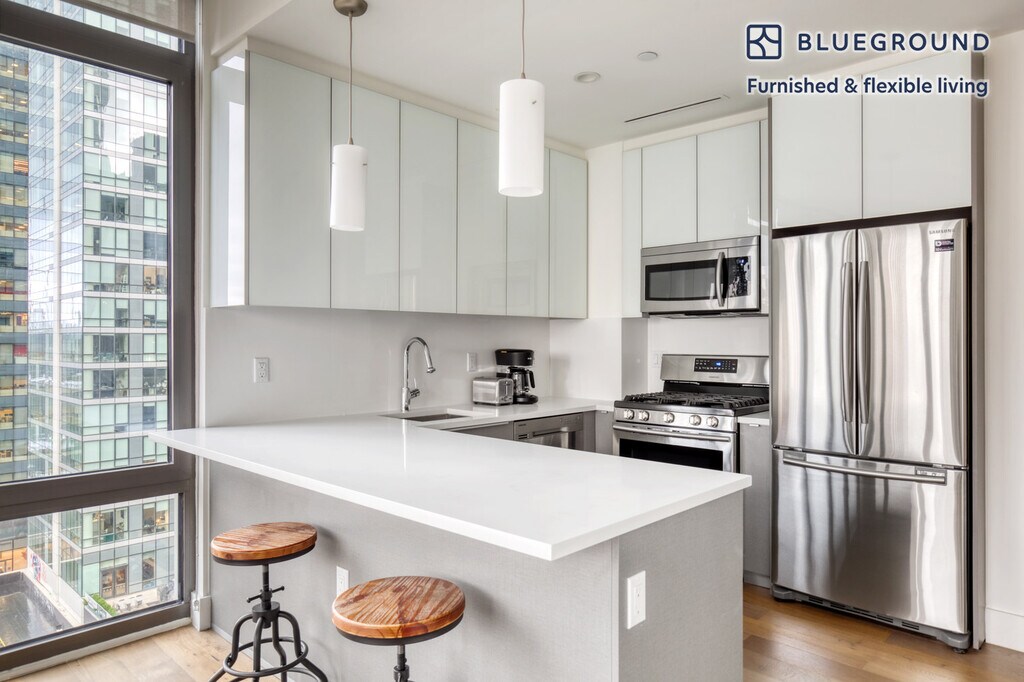 Show up and start living from day one in New York with this lovely one bedroom Blueground apartment. You’ll love coming home to this thoughtfully furnished, beautifully designed, and fully equipped Long Island City home with stunning balcony views over the city. (ID #NYC893) The advertised rate of $4,840/month is the lowest available price, based on a 12 month(s) stay with a move-in date of July 1, 2026. Rates vary depending on the duration of stay, season, and other parameters. For exact pricing and additional pricing components, please visit our website and enter your desired move-in and move-out dates. The rate is applicable when billed upfront; it can be higher if billed in multiple payments. Brokers are welcome to reach out. Were you looking for an unfurnished lease? Try Blueground instead and upgrade from unfurnished to furnished living: - Furnished at rates comparable to unfurnished - No setup or furniture costs - save thousands - Move-in ready - save time, just bring your suitcase Designed with you in mind Thoughtfully designed with bespoke finishes, modern furnishings, and a fully equipped kitchen, you’ll enjoy that “I’m home” feeling with this Blueground apartment. Whether you’re lounging in your stylish living room streaming the latest and greatest entertainment on the smart TV or premium wireless speaker, or getting some well-earned rest on the superior quality mattress with fully stocked linens, you’ll fall in love with everything this Long Island City apartment has to offer. This apartment also offers in-apartment laundry. Sleeping arrangements Queen Bed, 63in/160cm Amenities Building amenities unique to this one bedroom apartment include an on-site: - Doorman - Dryer - Elevator - Washing machine - Playroom Arrival and ongoing support The entire apartment is yours to enjoy! Throughout your stay, you’ll have access to our Client Experience team through the Blueground App. You can schedule additional cleanings, submit maintenance requests, and view our neighborhood recommendations with just a few taps. We’ll share all details upon confirmation of your stay. Ideally Located This furnished apartment is located in Long Island City, a neighborhood with amazing East River views. Nowadays, the area has become one of the best downtown Manhattan alternatives. Here, locals can enjoy a mix of activities from shopping on Jackson Avenue to indoor arts entertainment at MoMA PS1. Long Island City is also filled with modern public green spaces ideal for a stroll or jog. Grand Central Station is only a 20-minute subway ride away. Other things to note Building amenities may have an extra cost. This Blueground apartment has flexible lease options, allowing you to book it for one month, a year, or more. Brokes CYOF. We take great pride in ensuring every photo displayed is shot in our own units with our actual furnishings. That said, we regularly refresh our decor and furniture arrangement, which may differ from what’s pictured. Also note - This apartment is located near a railway, so expect to hear moderate noise when trains pass [SI]