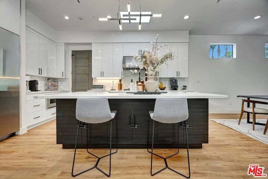 Situated south of Ventura Blvd in one of Sherman Oaks most coveted enclaves, this newer modern residence is a statement in refined design and effortless California living. Beyond its clean architectural lines, the home opens to expansive interiors defined by soaring 10 ceilings, oversized bedrooms, and walls of glass that flood the space with natural light. The living room is both dramatic and inviting, anchored by a sleek fireplace and frames by large glass doors that look out to the private backyard.The kitchen features custom tilework, premium finishes and generous walk-in pantry. The dining area is designed for both intimate evenings and large-scale entertaining as this open layout connects beautifully to the main living spaces. Five generously sized bedrooms include two exceptional primary suites, each feature spa-inspired bathrooms with custom tile, luxurious finishes and abundant closet space. All offering idea flexibility for both families, guests, or dedicated work from home space.Outdoors, the manicured grounds feel like a private resort, complete with a sparkling pool and spa. There's amble space for dining and lounging under the California sky. Moments from Ventura Boulevard's premier dining, boutiques, and top-rated schools. Easy access to the Westside makes this residence a strategic investment in location, stability and desirability.