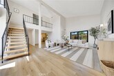 Welcome to 421 Larry Lane, a charming mid-century modern home nestled in the highly sought-after city of Placentia! This beautifully updated 3 bedroom, 2 bath residence features high vaulted ceilings and oversized windows that fill the home with natural light, creating a spacious, clean, and functional living space. The expansive living room flows effortlessly into the updated kitchen and dining area, perfect for everyday living and entertaining. The kitchen is sleek and modern, showcasing a subway tile backsplash, quartz countertops, new stainless steel appliances, and a generous eat-in island with ample space for cooking and gathering. The cozy dining room features a warm fireplace and newer sliding glass doors that open to a large backyard oasis complete with a built-in BBQ and a stylish new pergola, ideal for outdoor entertaining. Downstairs, the two spacious bedrooms offer custom built-in closet shelving and easy access to the tastefully remodeled hall bathroom, conveniently located near the kitchen and dining areas. Upstairs, the private primary suite provides a peaceful retreat with its own updated en-suite bathroom, designed with simplicity and modern elegance. Additional upgrades include new SPC plank flooring throughout the downstairs, fresh interior and exterior paint, a sleek gated front patio, and added concrete in both the front driveway and backyard for extra functionality. The attached 2-car garage is equipped with A/C and built-in storage, making it perfect for a home office or gym setup. Included in the sale are a new washer/dryer, refrigerator, and a smart Nest Yale lock for convenient keyless entry. Located near top-rated Placentia-Yorba Linda Unified schools, parks, shopping, and dining, this well-maintained home offers the perfect blend of comfort, style, and convenience