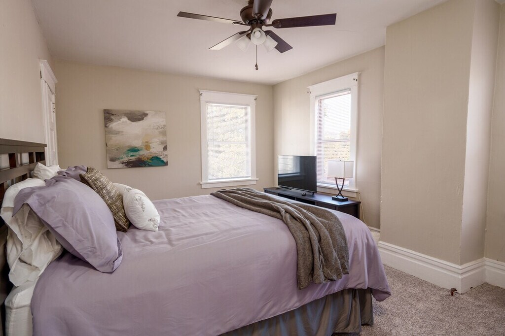 Stay in our beautiful 1,900 sq ft home in Morgantown, complete with a full basement suite and four bedrooms. Enjoy the convenience of fast Wi-Fi, ideal for remote work, and a fully equipped kitchen. The home is professionally cleaned and sanitized, ensuring a comfortable stay. Located just 5 minutes from the airport and all of Morgantown, this home offers easy access to the city's attractions. Guests love the professionally decorated space with unique furnishings and a warm ambiance. The home features brand new flooring and a light remodel, enhancing its historic charm. Enjoy easy self-check-in via a secure door keypad and lightning-fast Wi-Fi. The entire house and backyard are yours to enjoy during your stay. The home offers two free parking passes, with additional paid parking available at a nearby parking garage. This charming home is ideally located just 5 minutes from the airport and all of Morgantown, providing easy access to the city's attractions. While parking can be challenging, there are two free parking passes available, with additional paid parking nearby. The home, built in 1909, retains its historic character with some quirks like a door that sticks in the cold and original bathtub staining. It does not have central AC, but window units are provided for cooling. Smoking or vaping inside incurs a fee starting at $500, and parties are not allowed. Quiet hours are from 10 PM to 8 AM. Early check-ins may incur a fee, and unapproved late checkouts are charged $50 for every 30 minutes, plus any additional costs incurred by the next guest. The home is equipped with fast Wi-Fi, making it ideal for remote work. [SI]