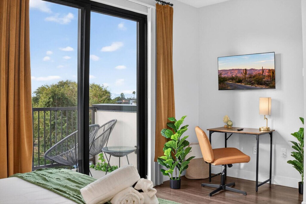 The advertised rate of $2,225/month is the lowest available price, based on a 30 day(s) stay with a move-in date of May 27, 2026. Rates vary depending on the duration of stay, season, and other parameters. For exact pricing and additional pricing components, please visit our website and enter your desired move-in and move-out dates. The rate is applicable when billed upfront; it can be higher if billed in multiple payments. Feel at home in this modern, zen-inspired escape in prime Arcadia. Designed for professionals, couples, and long-term stays, this apartment features rich tones, neon glow accents, and elevated finishes, enhanced by seamless smart tech. The living room features a pullout sofa that sleeps two extra guests, a smart TV with streaming apps, a neon “happy place” accent sign, and a forest green and burnt orange boho design. The brand-new appliances in the kitchen complement the designer backsplash and fully stocked cookware and essentials, including a coffee maker and kettle. The bedroom offers a premium queen bed, a smart TV, a dark, calming color palette, and closet storage. The bathroom features modern fixtures, fresh towels, and essentials. A high-speed Wi-Fi and Ethernet access are available. Select apartments feature a private outdoor space with a seating area. EV charging stations are available. Walkable dining options are nearby. Check-in and check-out times are mandatory unless scheduled and confirmed at least 24 hours in advance. There is a $60/hour penalty if you fail to check out by 10 am or by the agreed-upon check-out time. No shoes are to be worn inside the apartment, especially on the carpeted areas. Quiet hours start at 10 pm on weeknights and 11 pm on weekends, ending at 7 am. No parties and/or large noisy social gatherings are allowed; there is a $500 surcharge charged to groups that are deceitful about the use of the apartment, and guests partying will be asked to vacate the property immediately without refund. There is a strict no-smoking policy in all apartments, and you will be fined $500 plus the additional cost of the ozone machine to remove the smell if you violate this policy. A surcharge of $100 per undeclared guest per night will be applied for unapproved guests. If any games or remotes are missing, there will be a $100 charge to replace any missing items. We charge an additional $10 per guest after 3 guests. A guest is considered someone staying at the property for an extended period of time and/or sleeps over. Anyone visiting for under 2 hours is not considered a guest. Includes 1 Gbps internet speed with multiple ethernet ports in the apartment and community workspaces. [SI]