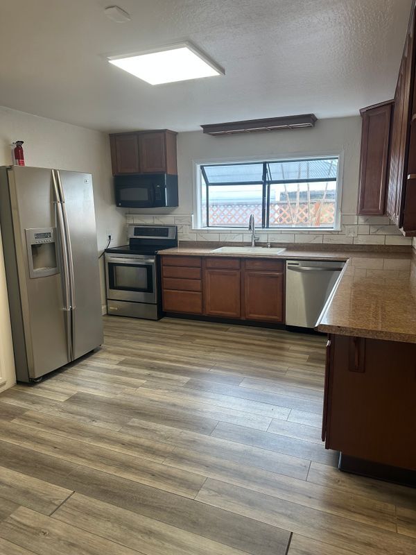 Cute, northside bungalow with welcoming front porch! Walk to downtown Livermore. 3 bedrooms, 1 bath house. Luxury Vinyl flooring, Stainless steel kitchen appliances and solid surface counters. Bathroom is newly remodeled. Close to freeway access and public transportation. Refrigerator included. Inside laundry with hookups. 1 car garage with large side yard access. Minimum credit score of 680 required.