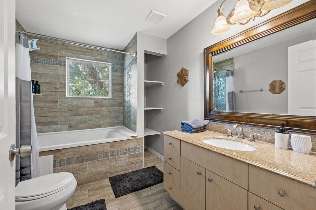 Feel at home in this charming 1-bedroom, 1.5-bath apartment, thoughtfully designed for comfort and convenience. This two-story residence features a king-size bed upstairs with a full bath, while a half bath is conveniently located downstairs. Enjoy the ease of self check-in and free parking, along with a fenced backyard for added privacy. The kitchen is fully equipped with a fridge, 2-burner stove, microwave, air fryer, blender, coffee maker, and all necessary cookware, including seasoning, drinking, and wine glasses. Relax in the living area with a dining set and two Smart TVs, or make use of the desk and chair for work or study. High-speed WiFi ensures you stay connected. Pets are welcome with a non-refundable pet fee of $150 per pet. Enjoy the convenience of a washer and dryer in the apartment. Located just 3 miles from Busch Gardens and 4 miles from Ybor, this apartment offers easy access to Tampa's top attractions. Downtown Tampa is only 6.3 miles away, with Hyde Park, Armature Works, and Amalie Arena all within a short drive. For beach lovers, Clearwater Beach is 28.5 miles away, while Madeira Beach and St. Pete Beach are also easily accessible. The apartment is also conveniently located near major hospitals and universities, including Moffitt Cancer Center and the University of South Florida. This apartment is pet-friendly and offers self check-in with a smart lock. Enjoy the privacy of a fenced backyard and the convenience of free parking. Smoking and parties are not permitted. Includes a desk and chair for a comfortable work-from-home experience, complemented by high-speed WiFi. A laptop computer is not included. [SI]