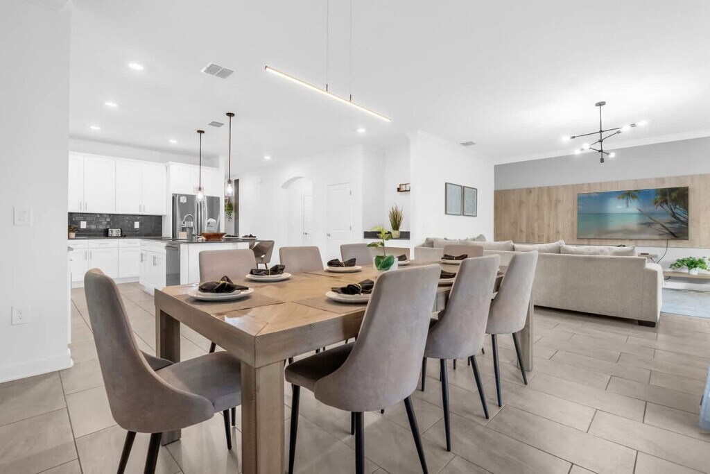 Step into a world of fun at this brand-new 6-bedroom retreat in Storey Lake Resort. More than just a stay, this is your ultimate family getaway. Challenge your crew in the game room, unwind by the private pool, or relax in the spacious lounges. Nestled in Kissimmee, you're just minutes from Disney, Universal, and SeaWorld, ready to make magical memories that last forever. Your perfect Orlando getaway awaits! Searching for the ideal retreat to celebrate special moments or unwind with family and friends? Look no further! This stunning 6-bedroom home at The Hideaway Club in Storey Lake Resort is conveniently located in Kissimmee, just minutes from Orlando’s top attractions, including Walt Disney World, Universal Studios, ESPN Wide World of Sports, and SeaWorld. Step inside and experience modern elegance with beautifully furnished rooms and stylish décor. The open-concept living area and kitchen provide the perfect space for family gatherings—whether you're watching the big game, sharing stories from an exciting day, or simply unwinding together. Outside, take a refreshing dip in the private pool and spa while enjoying your favorite shows on the outdoor smart TV with your loved ones. Want to explore without the crowds? Enjoy access to two incredible clubhouses at The Cove at Storey Lake Resort. One is within walking distance, while the main Hideaway Club is just a short drive away. Don’t feel like driving? Simply call for a complimentary shuttle to take you there! Use of the grill is included in the rental price, but propane refills are the guest’s responsibility. Pool and spa heating is available for $45 per night. The grill is available for a one-time fee rental which includes one propane tank. While the use of the pool and spa is complimentary, activating the heating system will incur an additional fee of $45 per night, with a minimum three-night charge. This fee will be charged separately and is not included in your initial booking. To request pool and spa heating, please contact customer agents after your reservation is confirmed. If paid in advance, the system will be activated at least 24 hours before your arrival. The Hideaway Club at Storey Lake Resort consists of a beautiful clubhouse and a resort-style swimming pool with incredible amenities. You can exercise at the community fitness center and enjoy the splash park features like a lazy river, splash pad, and water slides. The community also offers a full-service restaurant and bar and a variety of amenities including a beach volleyball court, mini golf, canoe and kayak rentals, and basketball. Transportation is offered with a free ride to The Hideaway Club for endless fun. If you don't feel like traveling to the main resort, you can always enjoy the wonderful pool, playground, club, and other spaces offered within the Cove at Storey Lake Resort, a more private hangout for guests available every day. Quiet hours are between 10:00 pm and 7:00 am. Only guests aged 25 and older are allowed unless accompanied by a responsible adult. No parties or events are permitted, and only registered guests can stay overnight. Vehicles parked in violation of the parking rules are subject to immediate towing. Charcoal grills are a fire hazard and strictly prohibited on the property. Discovery of usage of a charcoal grill may lead to a financial fine of up to $500 and eviction from the home. The pool and spa heating system relies on heat exchange technology and may not function optimally in extremely cold weather conditions. Please allow at least 24 hours for the pool to reach your desired temperature. The temperature of the spillover spa can fluctuate between 80°F and 100°F depending on outdoor conditions. The pool heating system is equipped with a safety mechanism that automatically shuts off the pump in extreme cold weather to prevent damage, which may result in temporary interruptions to the heating service. [SI]