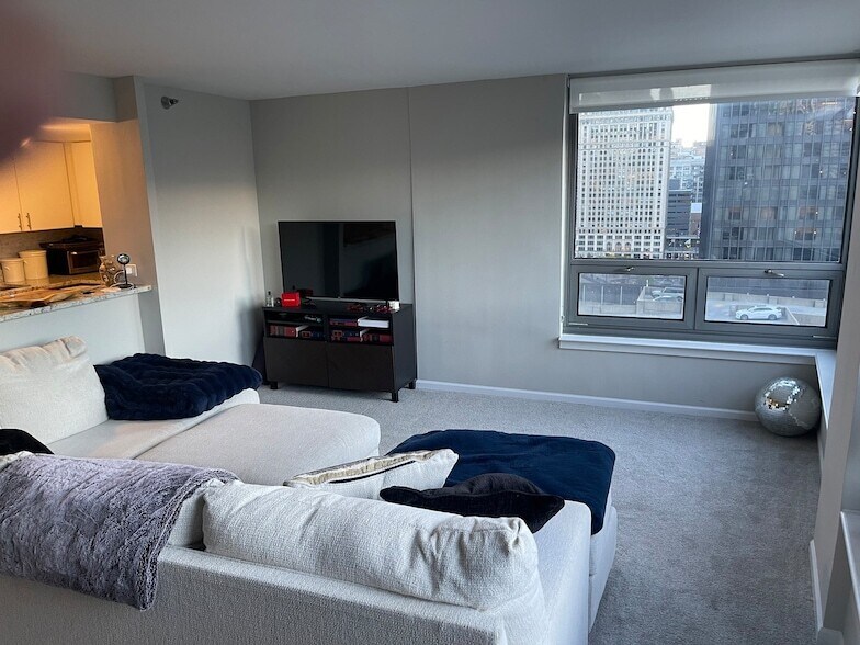 Available 12/1/25. IN UNIT LAUNDRY! Center of everything that River North and the Loop have to offer. Updated, Spacious, corner unit apartment with extra bonus room space to be used as den, home office, space for guests, exercise room, nursery, etc. Walk in Closet PLUS 3 additional full closets and a full pantry in kitchen. South and West Downtown views. Stainless Steel Appliances including dishwasher. Updated kitchen and bathrooms. Building Amenities include indoor pool, fitness center, sundeck, sauna, whirlpool, community room, business center, and 24 hour door staff.