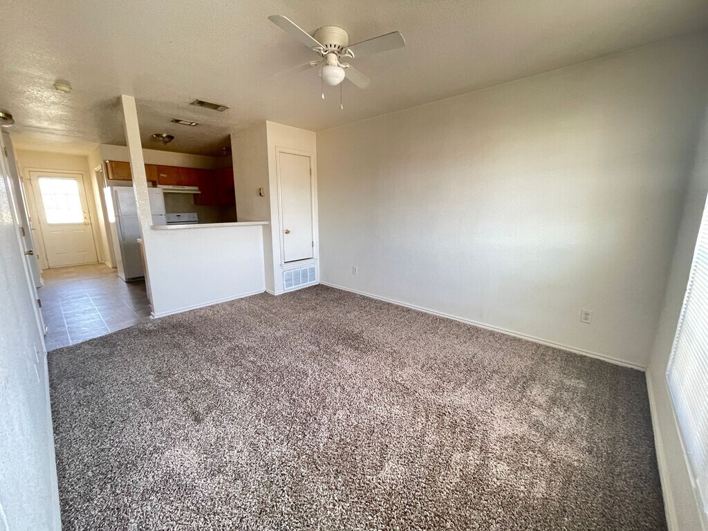 View 360 Virtual Tour: A 2 story, 2 bedroom, 1.5 bath townhouse, has 946 square feet, is all electric, with central heating and air conditioning. Living room, dining area, kitchen, laundry room, and 1/2 bath on ground floor (downstairs), with 2 bedrooms and full bath located on 2nd story (upstairs). Primary bedroom has large walk-in closet. Amenities provided are stove, refrigerator, dishwasher, ceiling fans, mini-blinds & garbage disposal with private parking. Disclaimer: The furnishings or enhancements shown are AI-generated and intended for inspiration only. They may not reflect the actual scale, condition, or current features of the property.