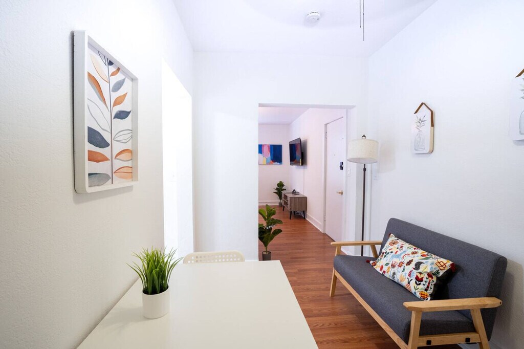 Feel at home in this stylish, newly renovated studio in Coral Gables. Located on the second floor of a building that requires climbing stairs, this bright apartment is a great option for your trip to Miami. This fully equipped studio includes a kitchen with full utensils, Wi-Fi, a smart TV, linens, towels, and courtesy shampoo and toilet paper for your first-day stay. It has a queen bed and a sofa bed, and can host up to 3 guests. A shared washer and dryer are available in the building. A dog is allowed in the unit with an extra cleaning fee, and certain breeds are accepted, given the size of the apartment. If you wish to have an extra cleaning in the middle of your stay, it can be provided for an extra charge. Early check-in and late check-out, if available, can be provided at an extra cost. The apartment is located in a very cozy neighborhood with free street parking near the building. To abide by all legal requirements and building security rules, you may be asked to provide a copy of your official government-issued photo ID, confirm your contact information, provide a valid credit card with a name that matches your ID and pass through our verification portal. A rental usage agreement that governs the terms of the stay must be signed. Check-in and check-out are done remotely, and you will be provided with a unique code for entering. Between the 20th and 30th of each month, a special pest cleaning is conducted, and access is needed on the designated day. [SI]