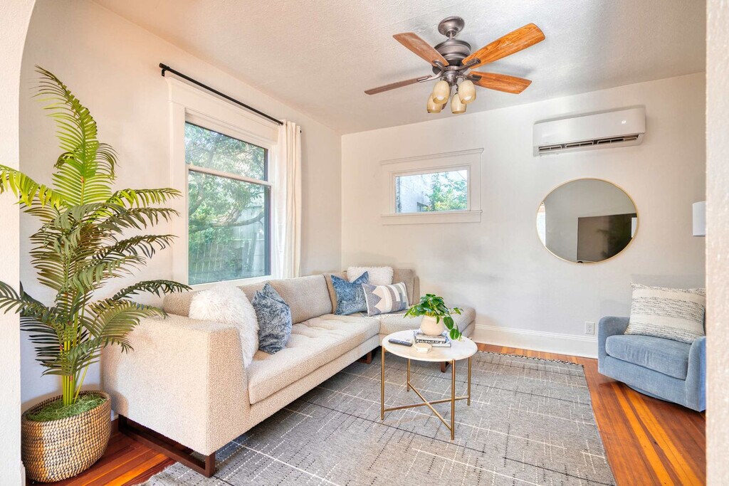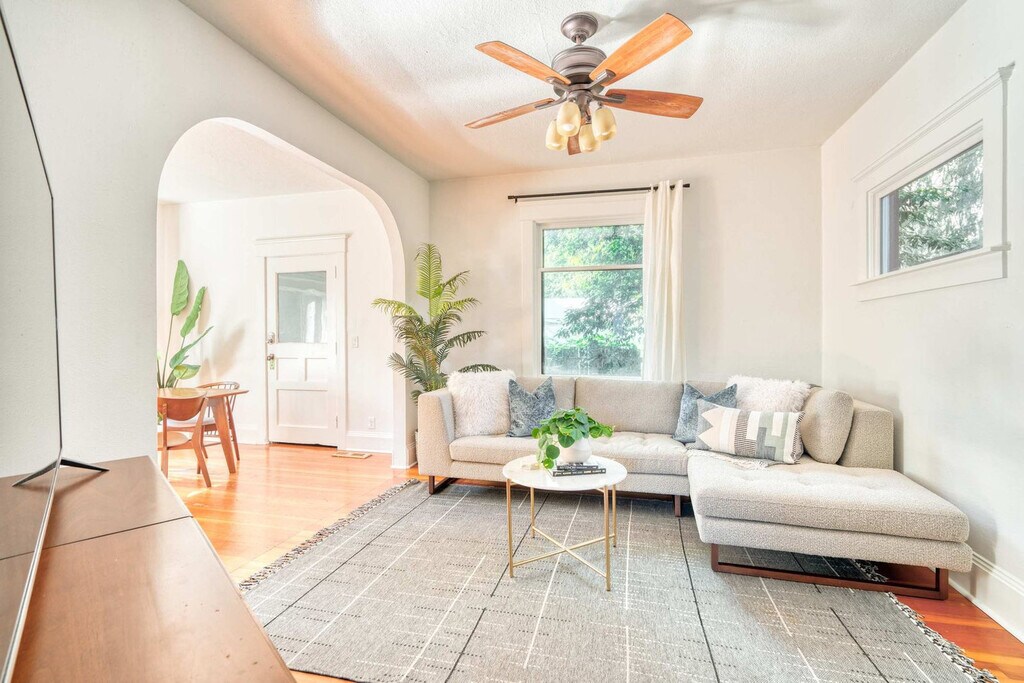 Experience the charm of Portland in this delightful mid-century home, complete with a newly renovated mother-in-law suite. Featuring original hardwood floors, rustic doors, industrial touches, and modern updates, this space offers a warm and inviting ambiance. With a 91 WalkScore and 96 BikeScore, you're just blocks away from top restaurants, bars, and shops. Enjoy modern amenities like updated mid-century furniture, a fully equipped kitchen, and high-speed Wi-Fi. This space will make you feel at home and fall in love with the city. The main home boasts a bright living room with a cozy sectional sofa, stylish décor, a ceiling fan, and large windows for natural light. The spacious dining area features a sleek wooden table and contemporary chairs. The fully equipped kitchen includes modern appliances and ample counter space. The first bedroom on the main floor offers a queen-sized bed, ample storage, and serene décor. Upstairs, the second bedroom also features a queen-sized bed, large windows, and charming décor, while the third bedroom includes a full-sized bed, personal TV, and playful décor. The modern bathroom has a shower/tub combo with plenty of towels and toiletries. The charming studio apartment provides a private retreat with a separate entrance, a queen-sized bed with a sunburst headboard, soft linens, a fully equipped kitchenette for light meals, and an elegant bathroom with a walk-in shower and sleek black fixtures. Thoughtful amenities include high-speed Wi-Fi, climate control, and a welcome kit with toiletries and local guides. Nestled in the heart of Northeast Portland, the intersection of NE Garfield and Martin Luther King Jr. Boulevard (MLK) is a vibrant and eclectic neighborhood that beautifully blends history, culture, and modern urban living. This area is a testament to Portland's rich diversity and community spirit, offering a unique living experience for residents and visitors alike. The neighborhood is steeped in history, with many buildings reflecting the architectural styles of the early 20th century. The tree-lined streets are dotted with charming Craftsman and Victorian homes, interspersed with contemporary apartments and condominiums. As one of Portland's most diverse neighborhoods, the area is a cultural melting pot with a wide range of cuisines and local businesses. MLK Boulevard serves as a bustling commercial hub with shops, cafes, and small businesses. Connectivity is a key feature with easy access to public transportation, including bus lines and the MAX light rail, making it convenient to explore Portland. The nearby Alberta Arts District and Mississippi Avenue offer even more options for dining, shopping, and entertainment. Quiet hours are observed between 22:00 and 8:00. [SI]