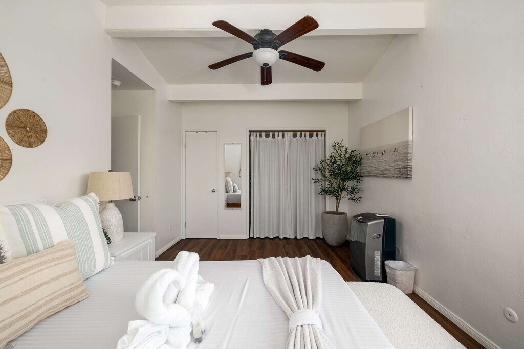Welcome to this chic 1-bedroom, 1-bathroom condo in a prime San Diego location. With a spacious open layout, this home features a large front patio, high-speed internet, and a smart TV. Enjoy the convenience of free street parking and a fully equipped kitchen, making it easy to feel at home. This spacious 1-bedroom condo comfortably accommodates up to 4 guests. The bedroom features a cozy queen bed, and the living room includes a queen sleeper sofa that easily unfolds into a second bed. Enjoy a cozy open-layout living room with fresh new décor, an oversized smart TV, and plenty of natural light. The adjacent dining area comfortably seats 4, perfect for meals, remote work, or game nights. The fully equipped kitchen boasts brand-new appliances, including a dishwasher and coffee maker, ensuring you have everything needed for a comfortable stay. This property offers free street parking for your convenience. Located just minutes from Newport Ave shops, cafes, and local eats, this condo is ideally situated for exploring San Diego. Enjoy a short drive to Ocean Beach Pier, OB Farmers Market, Hodad’s, Dog Beach, and Sunset Cliffs Natural Park. Further attractions like Liberty Station, SeaWorld, Point Loma trails, Old Town San Diego, Mission Bay Park, Downtown San Diego, and the San Diego Zoo are all within easy reach. This is a home, not a hotel, so please treat the space with love and care. Occupancy limits must not exceed the number listed on your reservation, and extra guests are not permitted to stay past 10:00 PM. A maximum of 3 additional daytime guests are allowed, and all must leave by 10:00 PM. Only small portable speakers at low volume are allowed outside, and any noise complaints may be treated as a violation of city rules. Absolutely no smoking of any kind is allowed on the property, with a $500 fine for violations. Please wash any used dishes, remove excess trash, and return furniture to its original position before checkout. Lock all doors and windows before leaving the home. The dining area comfortably seats 4, making it perfect for remote work with high-speed internet available. Registration Number: STR-11989L