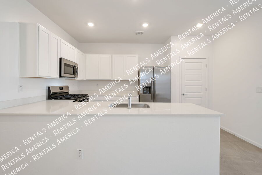 This beautiful and bright brand new home features a modern and low-maintenance layout contained to a convenient single level. Three secondary bedrooms are located off the foyer, leading to a spacious and flexible open-concept floorplan that combines the kitchen, dining room and Great Room. A covered patio offers seamless outdoor entertainment and recreation off the main living area. The lavish owner's suite is tucked into a private corner at the back of the home, complete with an en-suite bathroom and roomy walk-in closet. The Bella Vista Farms Community offers several amenities to enjoy year-round! Take advantage of the playground, swimming pool, picnic areas, sports court, basketball court, and greenbelt area! Don't miss out on being the first to call this newly built house, home! One Time Admin Fee: $300, Pet Deposit: $300/pet (if applicable), Service Fee: 2%. $39/month Resident Benefits Package, Helping Heroes Discount Available! Carpet Cats Allowed Ceramic Tile Disposal Dogs Allowed Dryer Garage Pets Allowed Washer