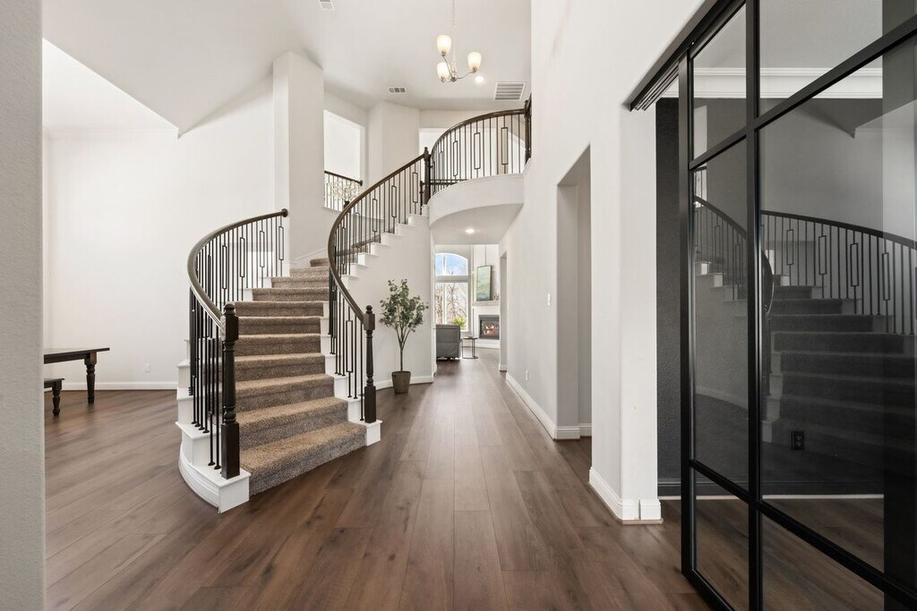 Experience the distinguished Rockwall lifestyle in the sought-after Breezy Hill community, which offers a range of amenities to include miles of tree lined trails and greenbelts, community pool with lounge area, playgrounds, tot lots, parks, ponds, pavilion, and multi-purpose ballpark. This location is conveniently situated just minutes from Lake Ray Hubbard and Downtown Rockwall. This exceptional residence is situated on an interior lot that backs to a spacious greenbelt with abundant trees and a nearby walking trail. Impressive drive-up appeal with professional landscaping and 3 car garage with cabinets, slatwall to hang tools, and coated floors. Grand foyer with soaring ceilings, a spiral staircase with black wrought iron railing, and access to the study with custom sliding black frame and glass door. Leading to the 2-car garage area is a secondary bedroom with full bathroom directly across the hall. The formal dining and breakfast nook are conveniently located near the delicious gourmet kitchen with stainless-steel appliances, refrigerator, and oversized island open to the stunning family room with fireplace, soaring ceilings, and incredible views of the greenbelt. The primary bedroom is located downstairs with window views of the greenbelt. The ensuite bath has a garden tub, separate shower, double vanities with large walk-in closet. Near the primary is the laundry room with room for a full-sized washer and dryer. Upstairs enjoy the huge game room or children’s retreat with nook for desk. Down the hallway, you’ll find 2 bedrooms and a full bathroom. Outback, enjoy the huge yard with the privacy the greenbelt provides. Additional features include recessed lighting and custom lighting, most with dimmers, as well as permanent and programmable exterior gemstone lighting under the eaves of the front elevation. This desired listing won’t last long!