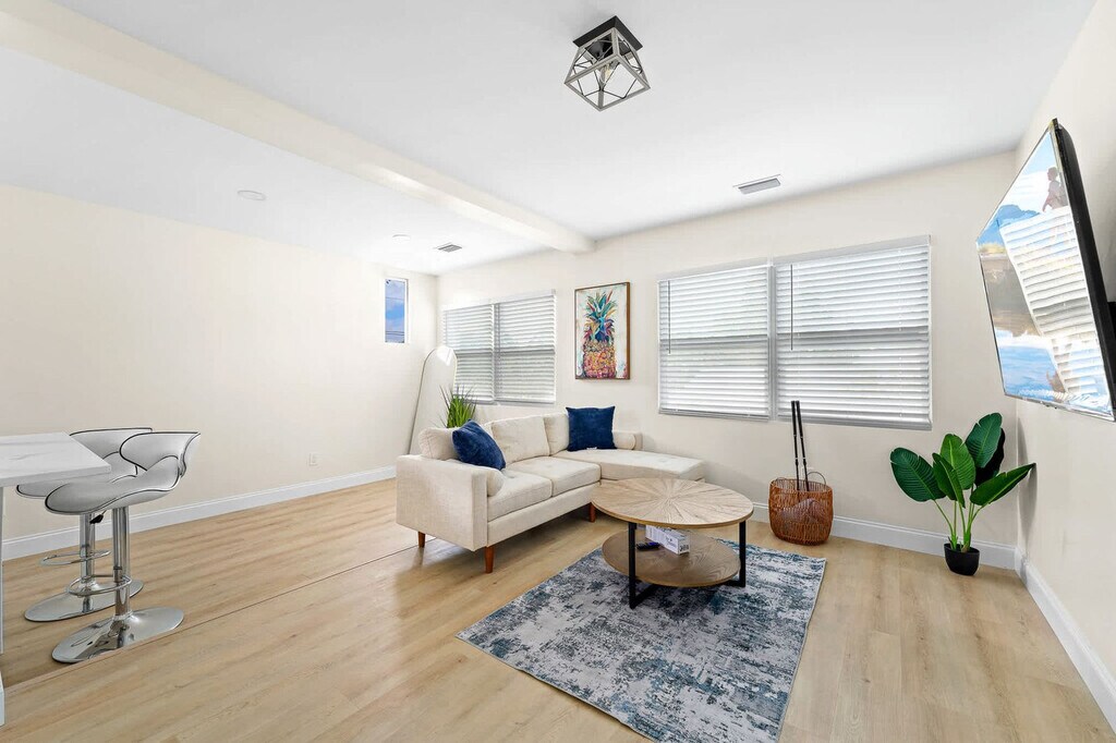 Feel at home in this Boynton Beach home, which boasts the perfect weather for outdoor activities. This home features 2 spacious bedrooms, 1 bathroom, and a living area. The living area invites you to relax in the spacious family room, equipped with a flat-screen TV and couches. The large, fully stocked kitchen features stainless steel appliances. Enjoy the outdoor hammock and furniture, as well as an outdoor shower. Pets are welcome with a pet fee and a $150 security deposit. Experience Old Florida charm in Boynton Beach! This home is located near amazing restaurants and boutiques along Ocean Avenue, canopy-covered walkways leading to a wide stretch of sand at Oceanfront Park, shops along Congress Avenue corridor and Renaissance Commons, Jaycee Park, and Gulfstream Park. There is easy access for canoes, kayaks, and paddleboards, as well as shaded picnic areas and a playground. Quiet hours are between 10:00 PM and 8:00 AM. There is absolutely no smoking and no drugs allowed inside the home or elsewhere on the property. Only the number of guests indicated on the reservation are allowed to stay overnight, unless otherwise agreed upon in written form. The number of vehicles on the property should never exceed two per reservation. We reserve the right to terminate a reservation without refund, and/or pursue monetary fines if guests are found to be in violation of any of these rules. The washer and dryer are shared with the unit above and are not inside this unit. Registration Number: [SI]