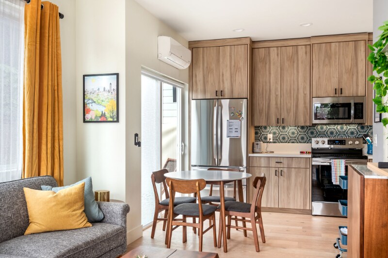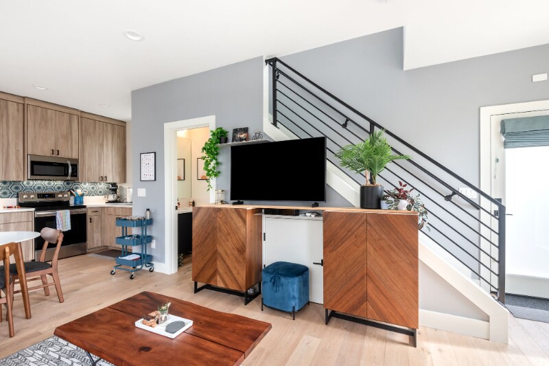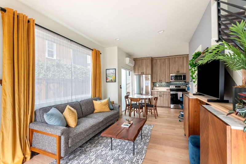 Property Id: 1743778 light bright and cheerful you'll fall in love with this colorful paradise in walkable Alberta Arts. Featuring a queen bed, in one room with walk in closet, and twin bed and desk w monitor in the other room this modern retreat is a comfy home from home. Amenities: AC/Heat 2 beds, queen, twin, and full foldout sofa large 50 inch smart tv fully equipped kitchen with crock pot, stand mixer, cutlery, plates, bowls, blender etc. Small attached fenced yard. Off street parking in lot across the street from unit