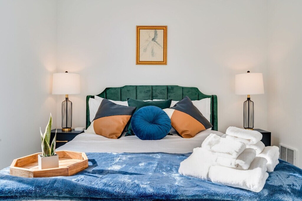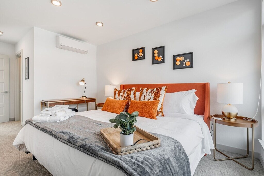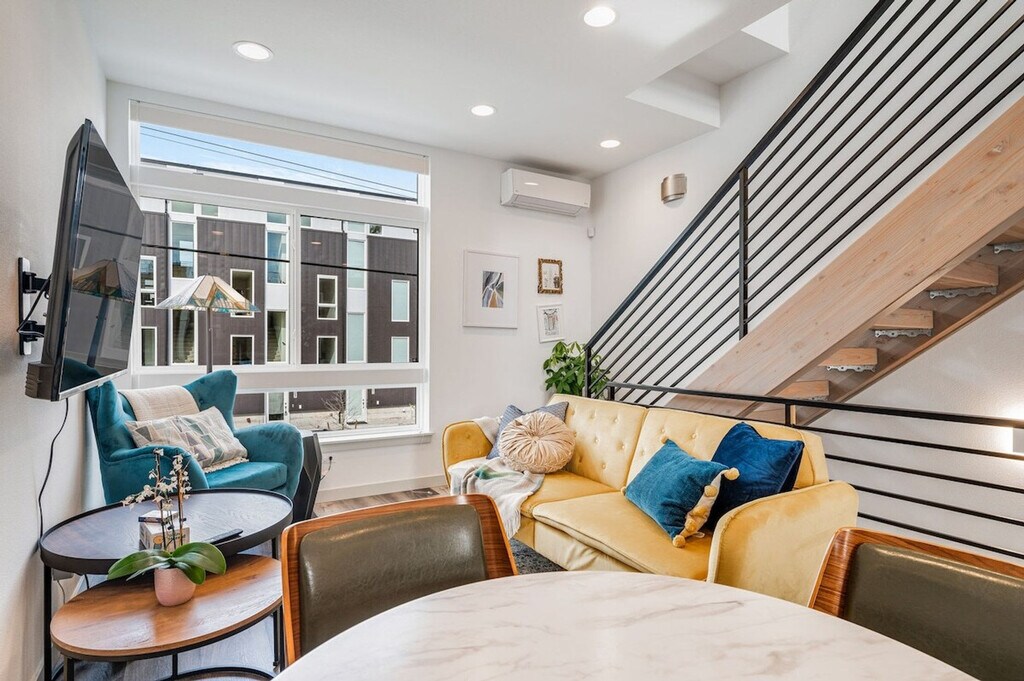 Feel at home in this modern townhouse in the heart of Fremont. This 2-bedroom, 2-bathroom home offers 968 sqft of living space. This is a 4-story townhome (including the rooftop) with a few steps to the entrance. Tastefully decorated and fully equipped, this home includes a kitchen fully stocked with kitchen appliances, cookware, silverware, servingware, spices, Keurig coffee and tea. Enjoy high-quality beds, mattresses, pillows, and linens for comfortable sleeping, fast internet, a smart TV for streaming, and an on-site washer and dryer for your laundry needs. Big windows provide lots of natural light. Dedicated parking is available right behind the home. Well-trained pets are welcome with a fee of $50 per pet per night. Located in the quirky and artistic Fremont neighborhood of Seattle, this home is close to unique shops, restaurants, and attractions. Walk just 10 minutes to discover the amazing Woodland Park Zoo or drive 4 minutes to visit the Fremont Troll, Theo Chocolate, and the Sunday Street Market. With the Space Needle just 23 minutes away and Pike Place Market a mere 25 minutes away, this home is the perfect base for your Seattle adventures. The location is near quirky cafes, tech offices, yoga studios, a bus line, fabulous eateries, parks, and lakes. This townhome is not handicap friendly, and guests must be comfortable with stairs as there are multiple stories. Strictly no parties and events are allowed, quiet hours are between 10 pm and 8 am, no smoking or vaping of any kind is allowed anywhere on the property including outdoor areas, no digital piracy is allowed, and no shoes are allowed in the home. A $500 fine will be imposed per violation. Kindly refrain from allowing pets on furniture and linens including couches, throws, beds, pillows, and towels. Please do not leave pets unattended and please bring poop bags and pick up after your pets. Includes a dedicated desk and chair for remote work. Registration Number: STR-OPLI-23-000461 [SI]