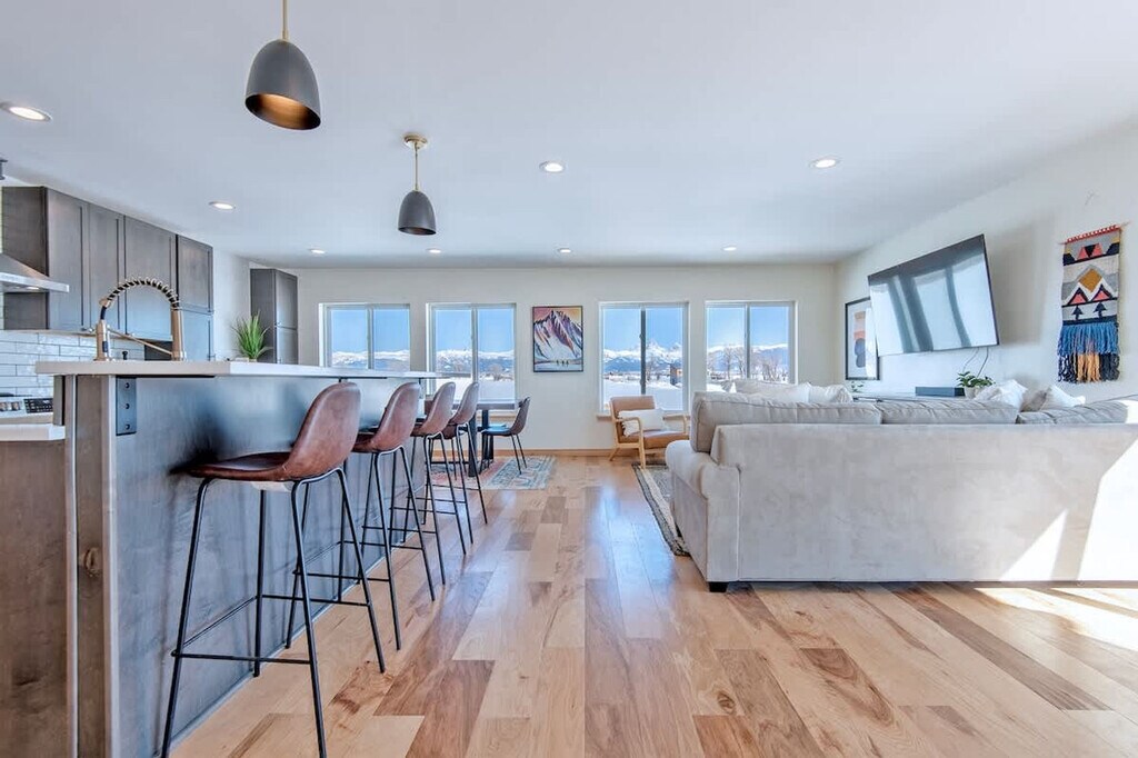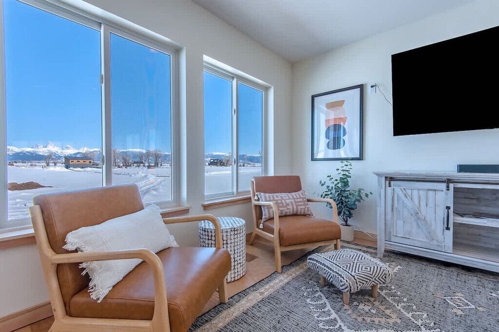 Experience the breathtaking 360-degree views of Teton Valley with this newly constructed 3-bedroom vacation home. Perfect for your next getaway, this home offers a prime location to access everything the region has to offer, including Yellowstone Park, Grand Teton Park, Jackson Hole, and Grand Targhee. The open living room, with its modern design and incredible views of the Teton Mountains, is a sight to behold. Natural light streams in, illuminating the warm tones that adorn the walls, creating a cozy atmosphere for relaxation. The modern kitchen is a chef's dream, featuring a sleek design and luxurious amenities. The spacious layout provides plenty of counter space for meal preparation, while the bar seating area is perfect for entertaining guests. The master suite offers a plush king-size bed with stunning mountain views, while the guest bedroom upstairs includes a cozy queen bed and a pull-out mattress for extra guests. Downstairs, a third private bedroom with an en-suite bathroom offers a queen-size bed and added privacy. The property includes a full garage with an EV charger for your electric vehicles, making it easy to prepare for a day's adventure and unpack afterward. This home is ideally located with easy access to various attractions. Yellowstone's West Entrance is 1 hour and 52 minutes away, while the South Entrance is 2 hours and 33 minutes away. Grand Teton is just 1 hour and 6 minutes away. For ski enthusiasts, Grand Targhee Ski & Summer Resort is a 27-minute drive, and Jackson Hole Mountain Resort is 58 minutes away. The home is also conveniently located near regional airports and area towns, making it easy to explore the surrounding areas. Guests are expected to treat the home as their own and respect the neighbors and local community. Quiet hours are from 9 pm to 8 am, and no events, parties, or large gatherings are allowed. Smoking or vaping in the home or on the decks is prohibited, with an additional charge applied if any butts are found on the property. Exterior lights should be turned off at night to preserve the dark skies. A maximum of four licensed vehicles is allowed in the driveway and garages. No riding of snow machines, dirt bikes, or ATVs is permitted in the subdivision or at the rental property. Candles or incense should not be burned in the home, and fireworks are not allowed on the premises. All main entry doors should be locked when not occupied. Guests must clean off in the shower or bath before using the hot tub, and additional cleaning fees apply if the hot tub requires extra cleaning. Fines apply for violations, including smoking in the house or garage, failure to follow house rules, and mistreatment of the hot tub, with a minimum $500 fine for certain violations. A laptop computer is not included.