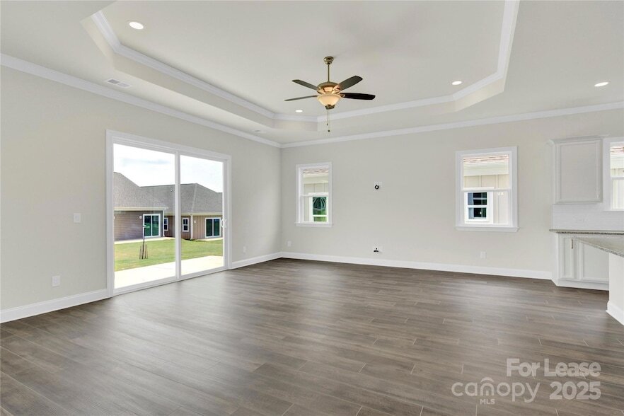 Desirable Wooded Lot! Welcome to this spacious and inviting 3-bedroom ranch-style home. With wide hallways and soaring 10' ceilings this open floor plan home really makes for an airy and open ambiance. The living room opens to the dining and kitchen area perfect for hosting family gatherings and dinner parties. The kitchen features a large island, walk-in pantry and ample cabinet storage. The primary bedroom offers a spacious layout, tray ceiling, and a walk-in closet. The primary bath has an oversized walk-in shower and ample vanity space. Two additional bedrooms and a bathroom offer versatility, whether you need guest rooms, a home office or a hobby room. Two Car garage. Kitchen appliances are included. Enjoy carefree living with Lawn Maintenance is included.