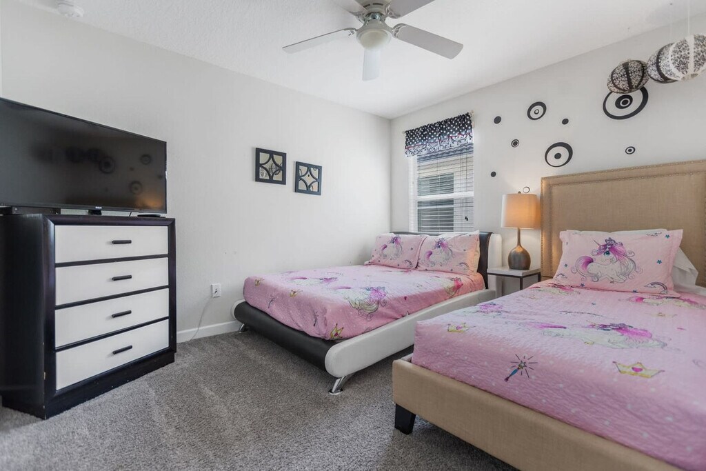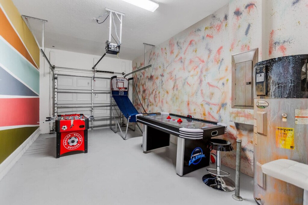 Welcome to our spacious 6-bedroom home located in the heart of Storey Lake Resort, Kissimmee, just 15 minutes away from Orlando's main attractions like Disney World. This centrally located property offers comfort and convenience for families and travel parties, ensuring you feel at home during your stay. This luxurious home is designed to make your Disney dream a reality. The loft living room is perfect for family gatherings, and you can enjoy friendly games of pool, air hockey, or foosball. The kitchen is fully equipped with all the necessary tools to prepare meals for your family. Sheets and towels are provided, along with a starter kit of toiletries and kitchen supplies. The property features a private screened-in pool, Jacuzzi, and a covered lanai with patio furniture. Pool heating is available for an additional fee of $45 per night, with a minimum three-night charge. Our grill is available for a one-time rental fee, which includes one propane tank. Situated in Storey Lake Resort, one of the newest resort communities in Orlando/Kissimmee, this property offers easy access to theme parks, dining, and shopping. The resort amenities include a 10,000 sq.ft. clubhouse with a state-of-the-art fitness center, a resort-style pool with a kids' splash area, a lazy river, a tiki bar, and more. This property is not suitable for parties. Quiet hours are from 10:00 PM to 7:00 AM. Only registered guests can stay overnight, and the use of charcoal grills is strictly prohibited, with a potential fine of up to $500 for violations. The pool heating system may not function optimally in extremely cold weather conditions and requires at least 24 hours to reach the desired temperature. A third party runs the resort facilities, and availability cannot be guaranteed. [SI]